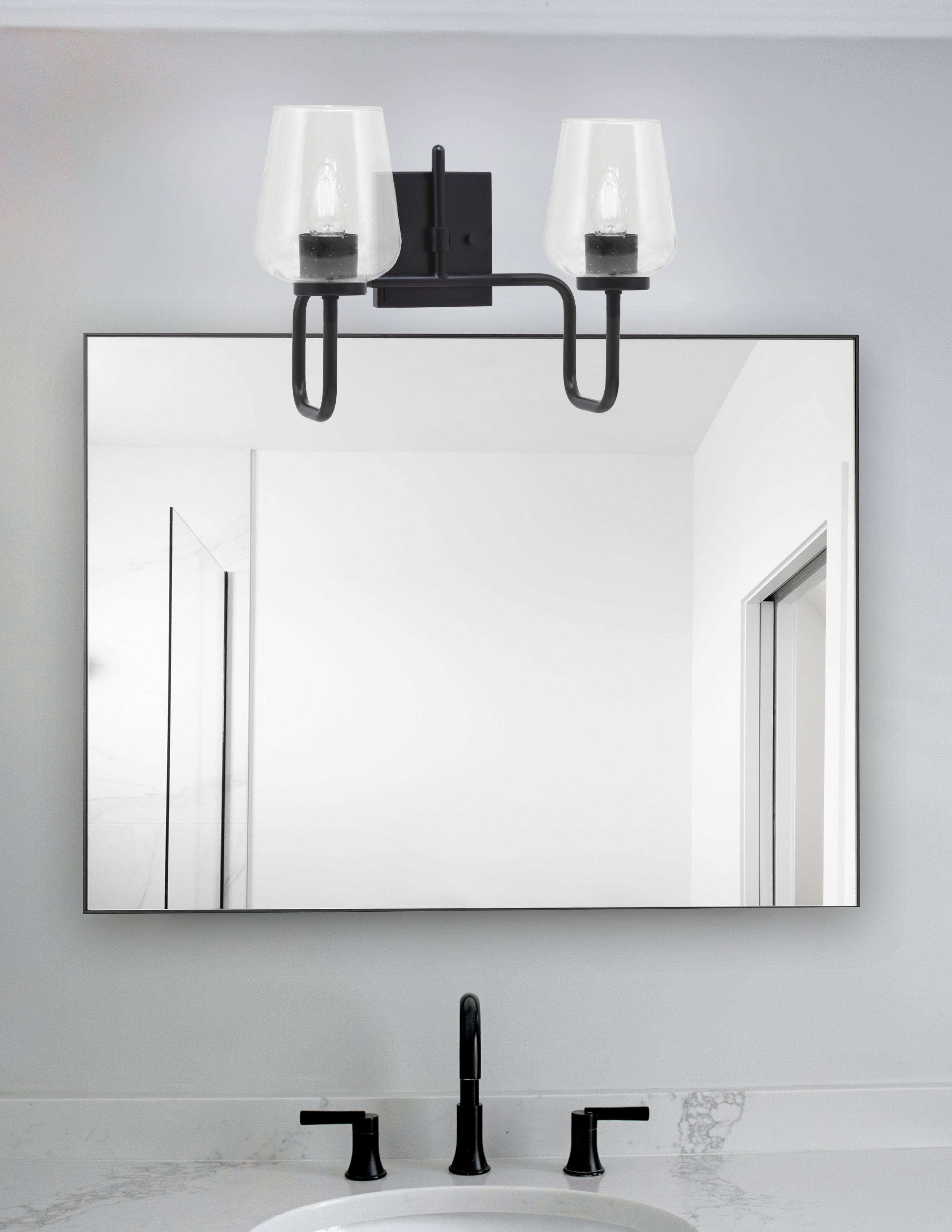 The Sandia 2 Light Bath Bar in a Matte Black Finish with 5″ Clear Bubble Glass Shades brings a stylish touch to your bathroom lighting. The sleek black finish pairs beautifully with the textured clear glass, offering a modern yet inviting ambiance. Its compact size makes it an ideal choice for smaller bathrooms, powder rooms, or as accent lighting in larger spaces.