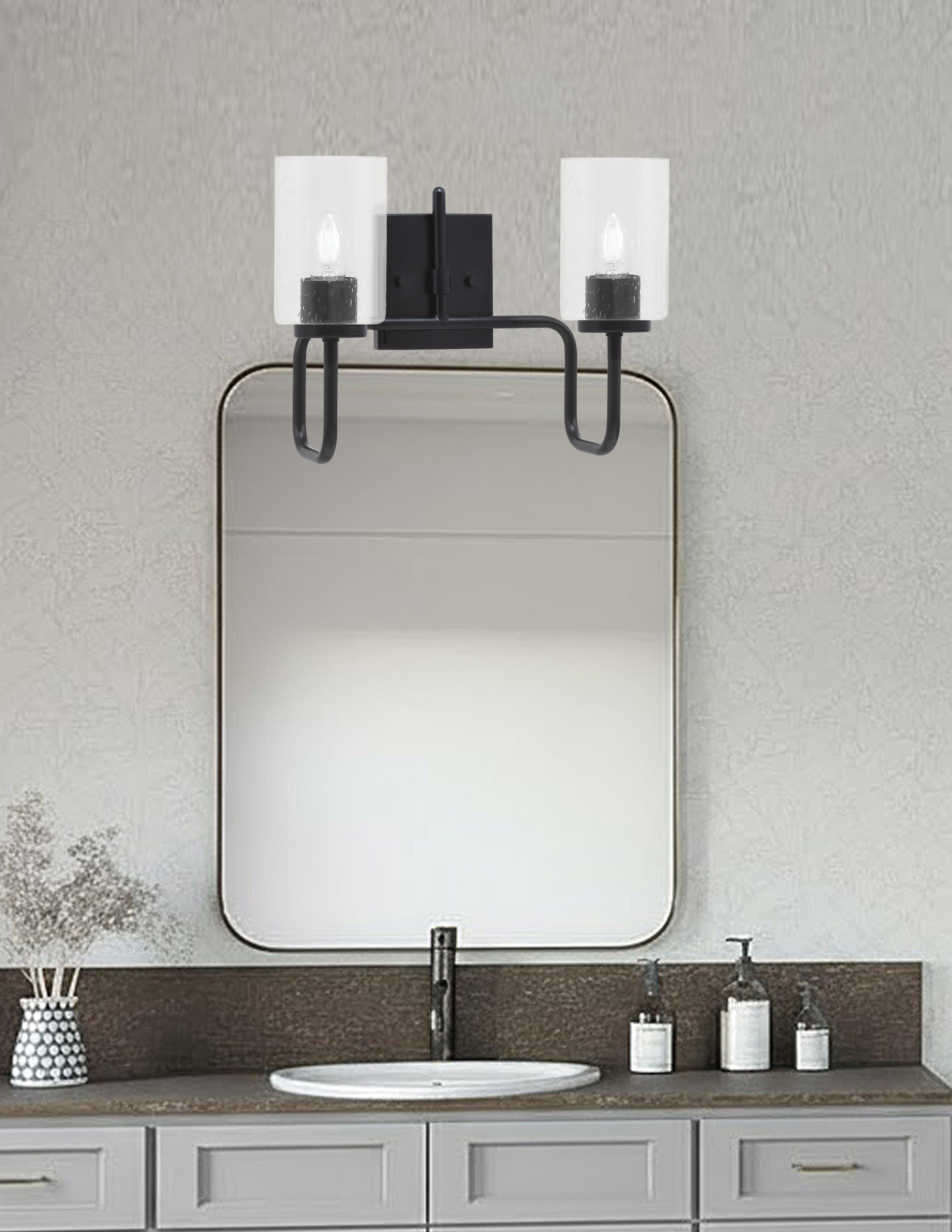 The Sandia 2 Light Bath Bar with its sleek Matte Black Finish and distinctive 4″ Clear Bubble Glass Shades brings a touch of modern elegance to any bathroom. The combination of the matte black frame with the textured bubble glass creates a stunning contrast, making this fixture an eye-catching focal point. Perfect for those who appreciate industrial style with a soft, contemporary twist.