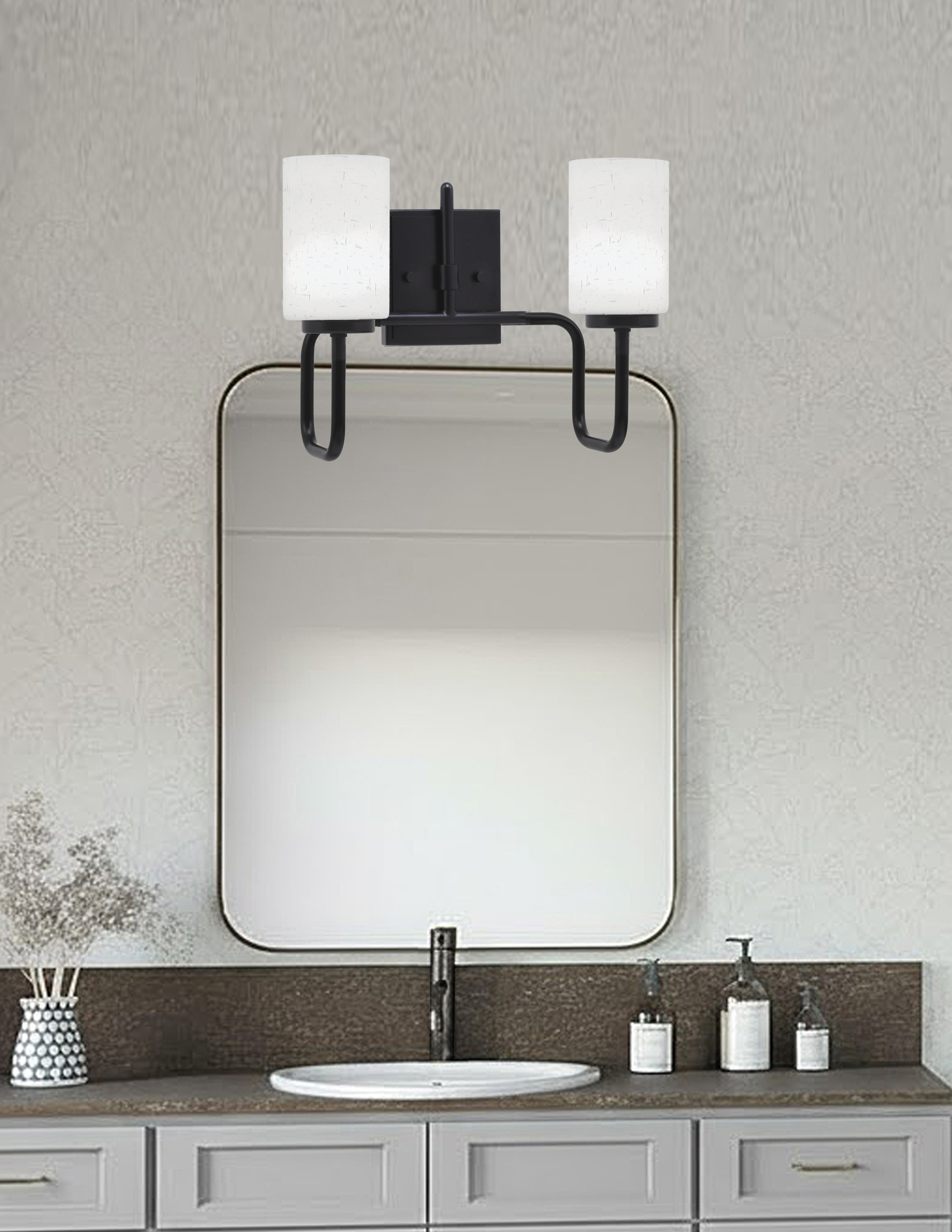 Elevate your bathroom with the Sandia 2-Light Bath Bar, a sleek and modern lighting fixture that combines style and functionality. Featuring a matte black finish, this bath bar offers a contemporary look that complements a variety of décor styles. The two 4-inch white muslin glass shades provide soft, diffused light, creating a warm and inviting ambiance.