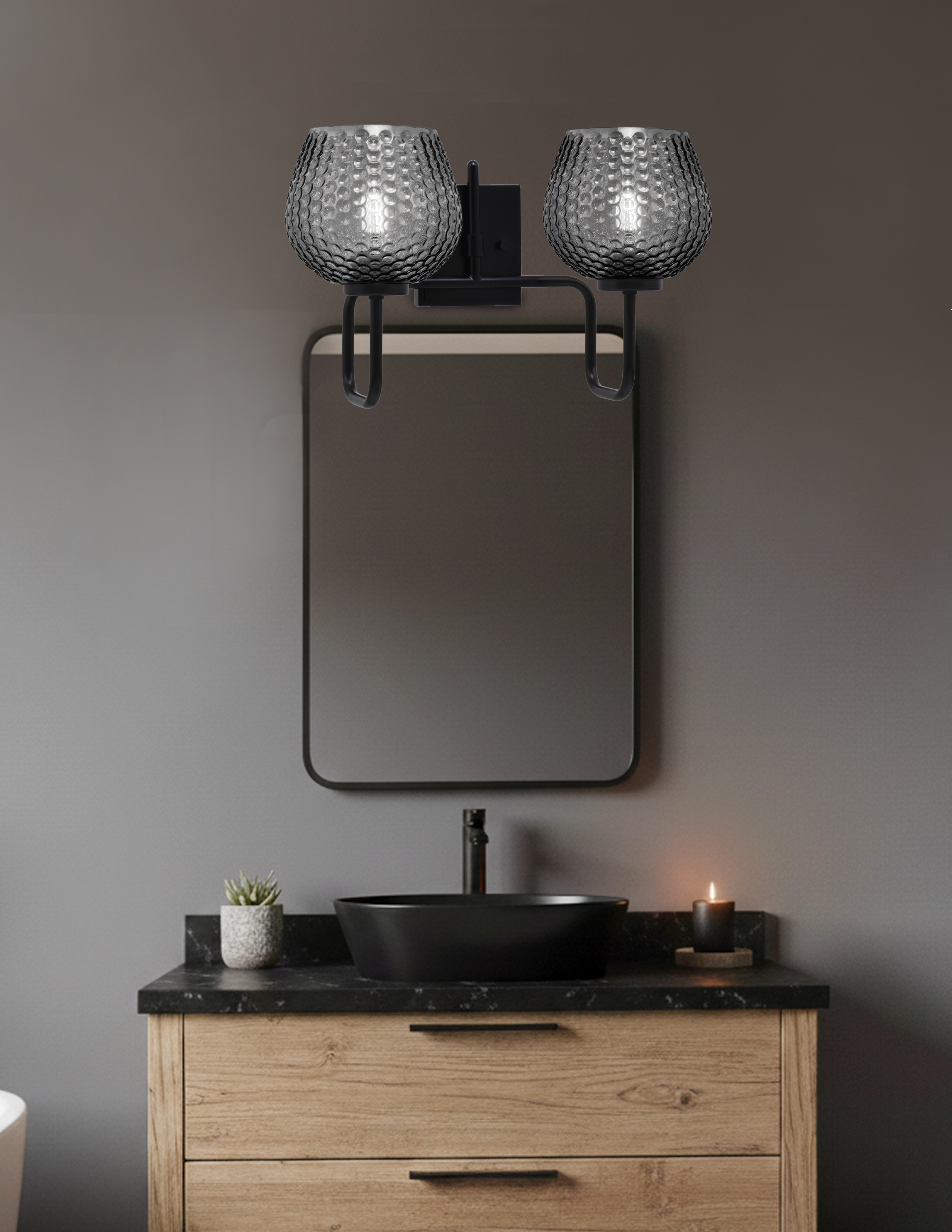 Enhance your bathroom with the bold yet refined Sandia 2-Light Bath Bar. The Matte Black Finish provides a sleek, modern touch, while the 6″ Smoke Textured Glass shades bring a sophisticated texture and a rich smoky hue. The unique texture of the glass helps diffuse light, creating a soft, ambient glow that adds warmth and style to your space. Perfect for contemporary, industrial, or transitional bathrooms.