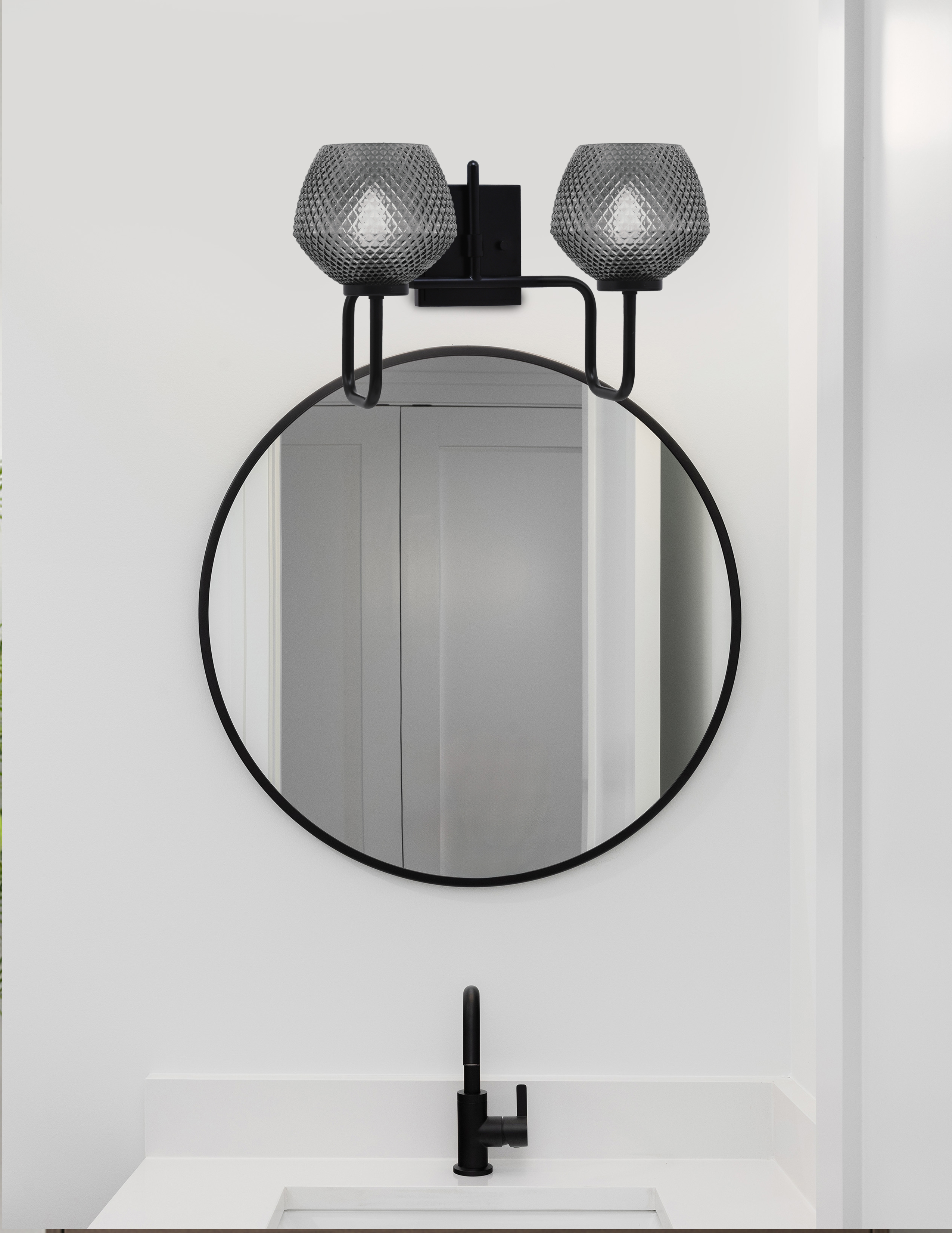 Bring modern sophistication to your bathroom with the Sandia 2-Light Bath Bar. Featuring a sleek Matte Black Finish, this fixture offers a bold contrast to the 6″ Smoke Textured Glass shades. The textured glass creates a unique, dimensional look while the smoky hue gently diffuses light, adding warmth and ambiance to your space.
