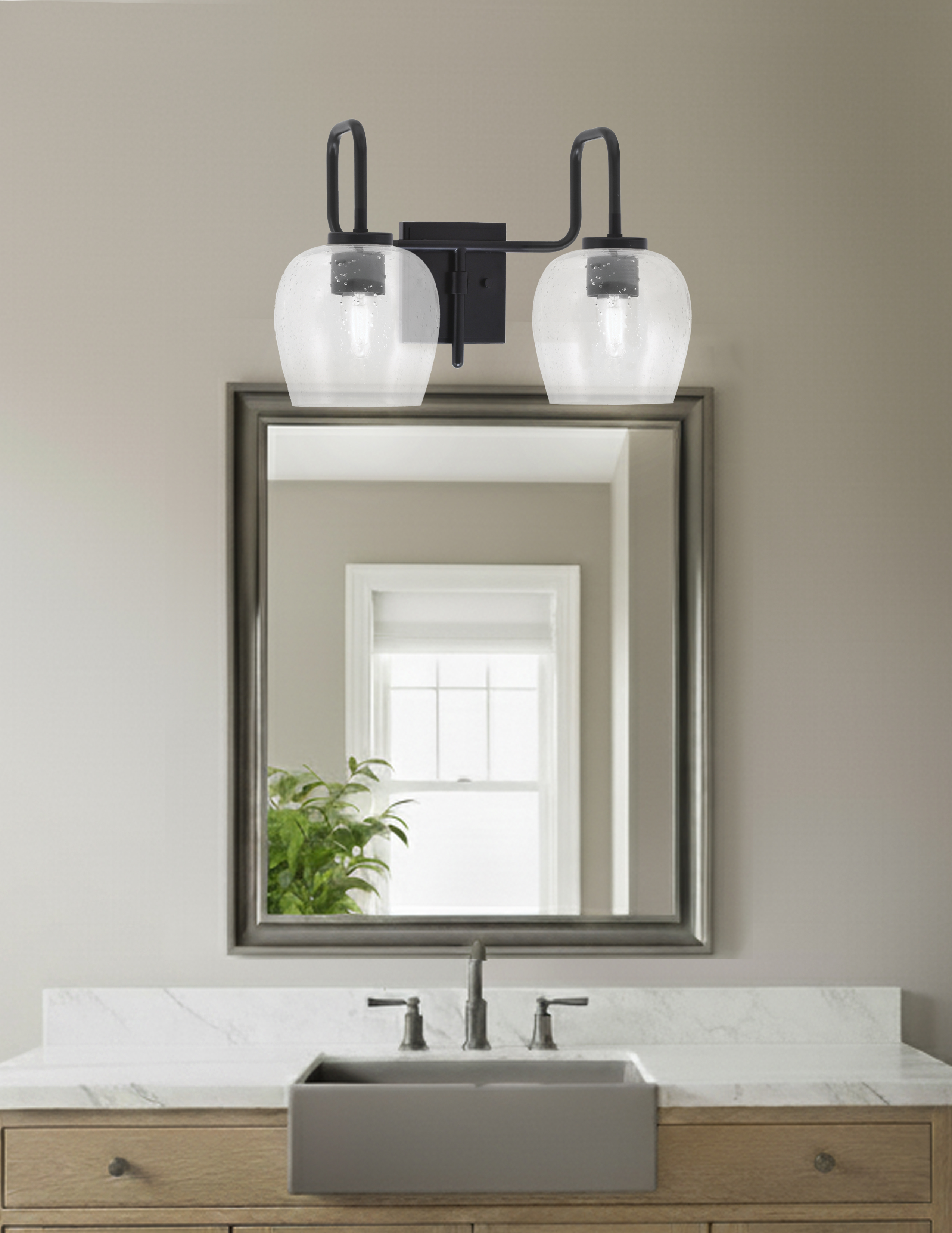 Bring modern sophistication to your bathroom with the Sandia 2-Light Bath Bar. Finished in a bold Matte Black Finish, this fixture contrasts beautifully with the 6″ Clear Bubble Glass shades, which feature a unique bubble texture that diffuses light in a dynamic and inviting way. The clear glass ensures a bright, even illumination, while the texture adds visual interest.