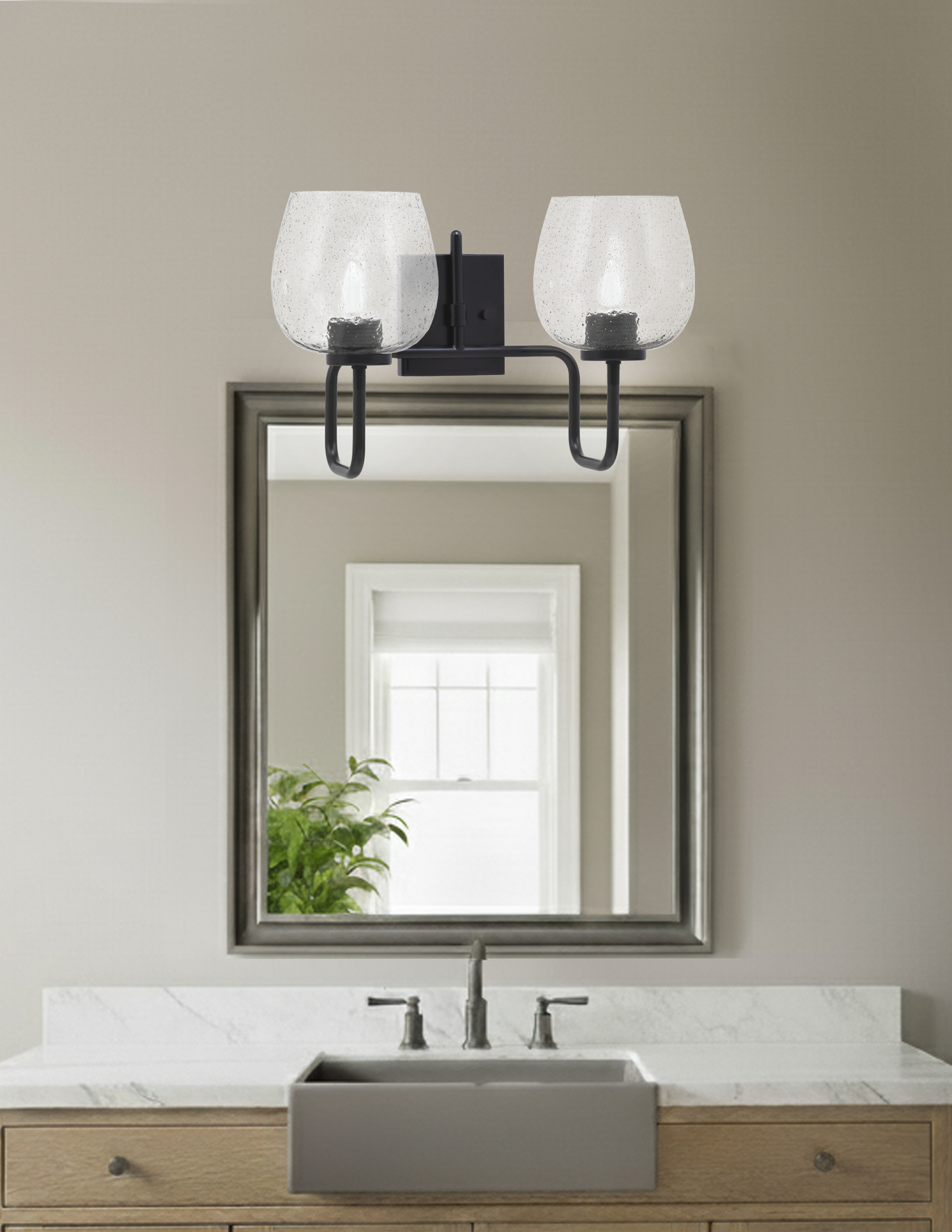 Bring modern sophistication to your bathroom with the Sandia 2-Light Bath Bar. Featuring a sleek Matte Black Finish, this fixture pairs beautifully with the 6″ Smoke Bubble Glass shades. The textured bubble pattern in the glass creates a dynamic visual effect, while the soft smoke hue adds a touch of warmth and elegance to the light.