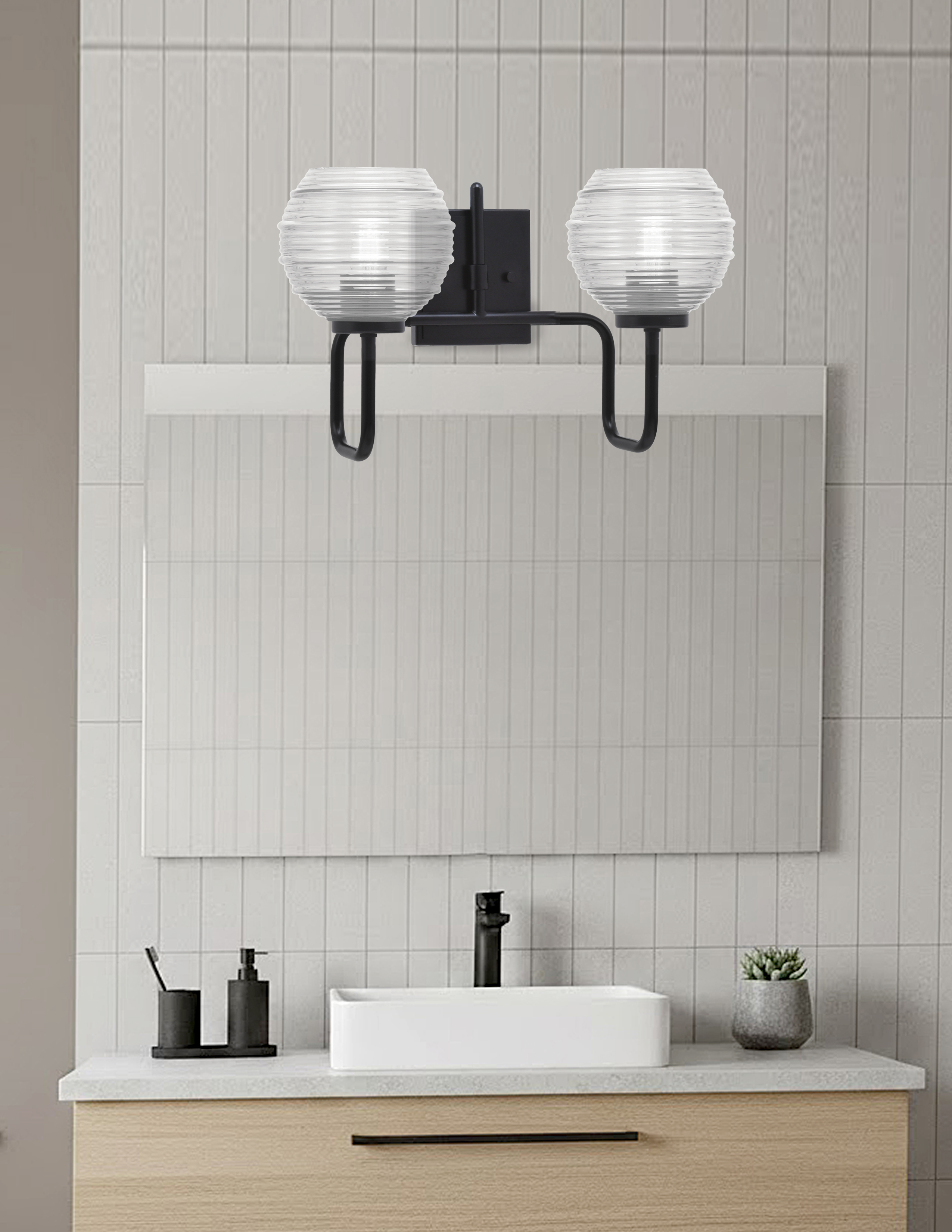 Bring a touch of modern sophistication to your bathroom with the Sandia 2-Light Bath Bar. The bold Matte Black Finish provides a sleek, contemporary look, while the 6″ Clear Ribbed Glass shades add texture and dimension with their elegant ribbed design. This bath bar combines both functional illumination and stylish flair, making it an ideal addition to any vanity or powder room.