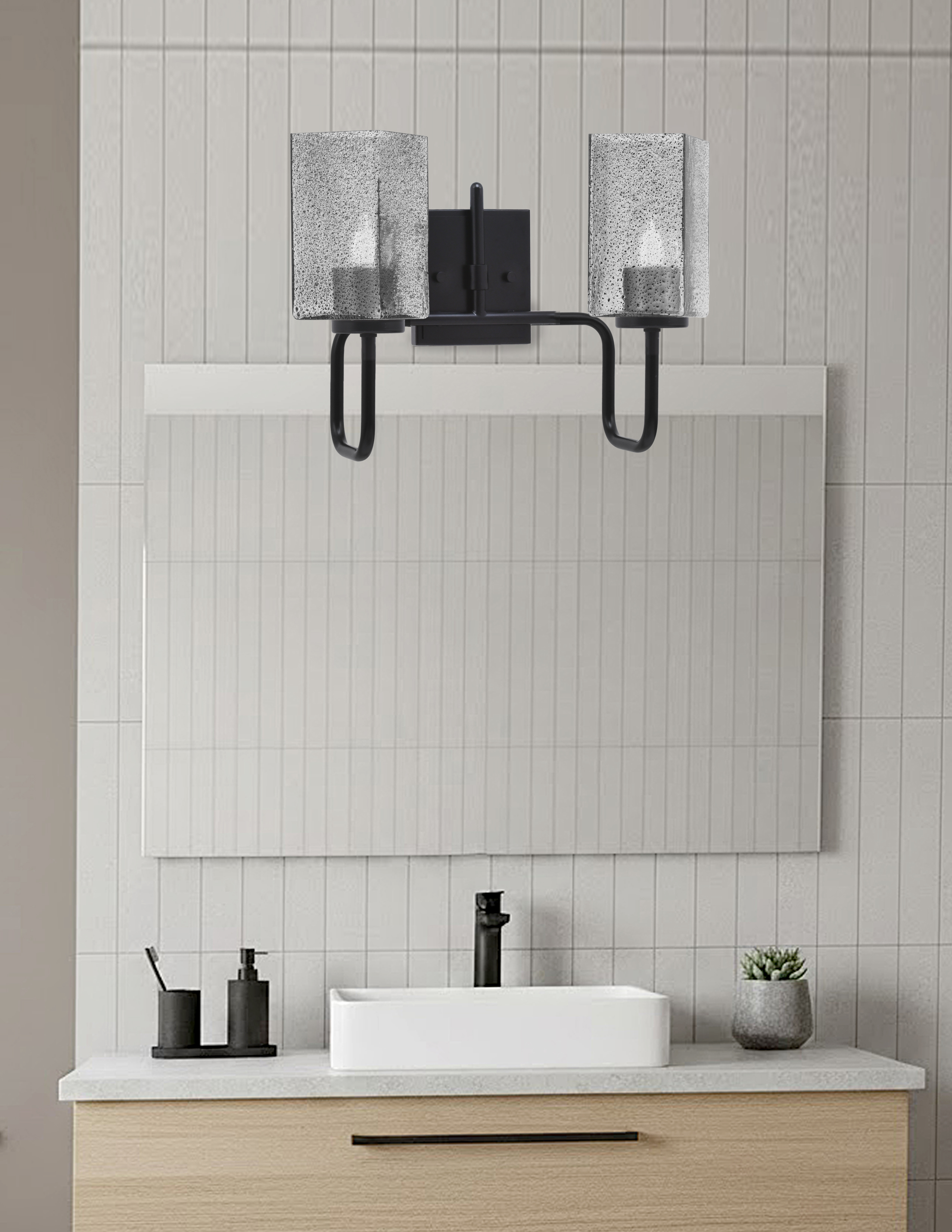 Elevate your bathroom’s ambiance with the sleek and modern Sandia 2-Light Bath Bar. Featuring a Matte Black Finish, this fixture brings a bold contrast that complements a variety of decor styles. The 3.5″ Square Smoke Bubble Glass shades add a touch of sophistication, diffusing light beautifully while showcasing a unique bubbled texture.