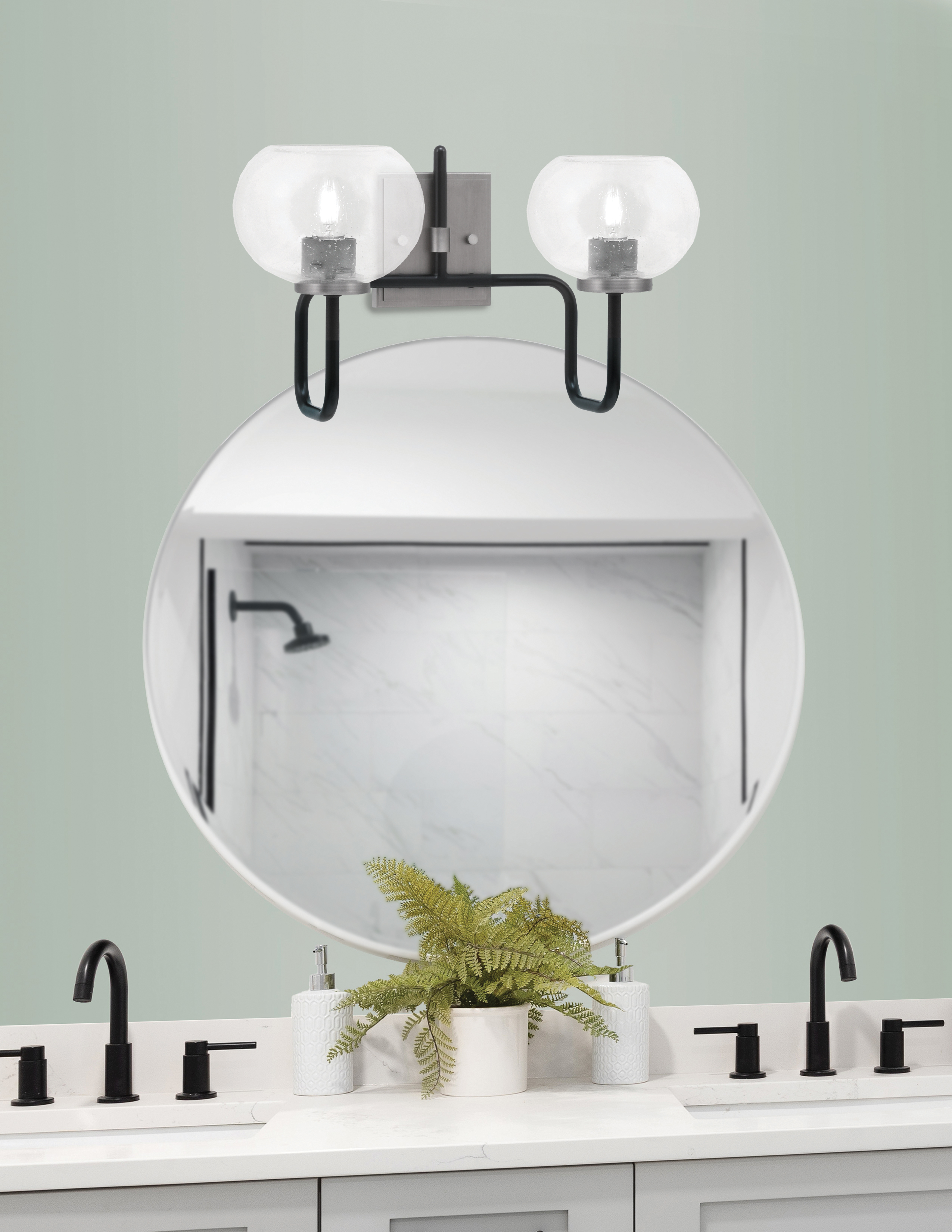Elevate your bathroom with the modern elegance of the Sandia 2-Light Bath Bar. Featuring a sleek Matte Black & Graphite Finish, this fixture brings a bold contrast to the 7″ Clear Bubble Glass shades. The bubble pattern in the glass creates a visually dynamic effect, while the clear glass ensures bright, even illumination. This bath bar blends both style and function.
