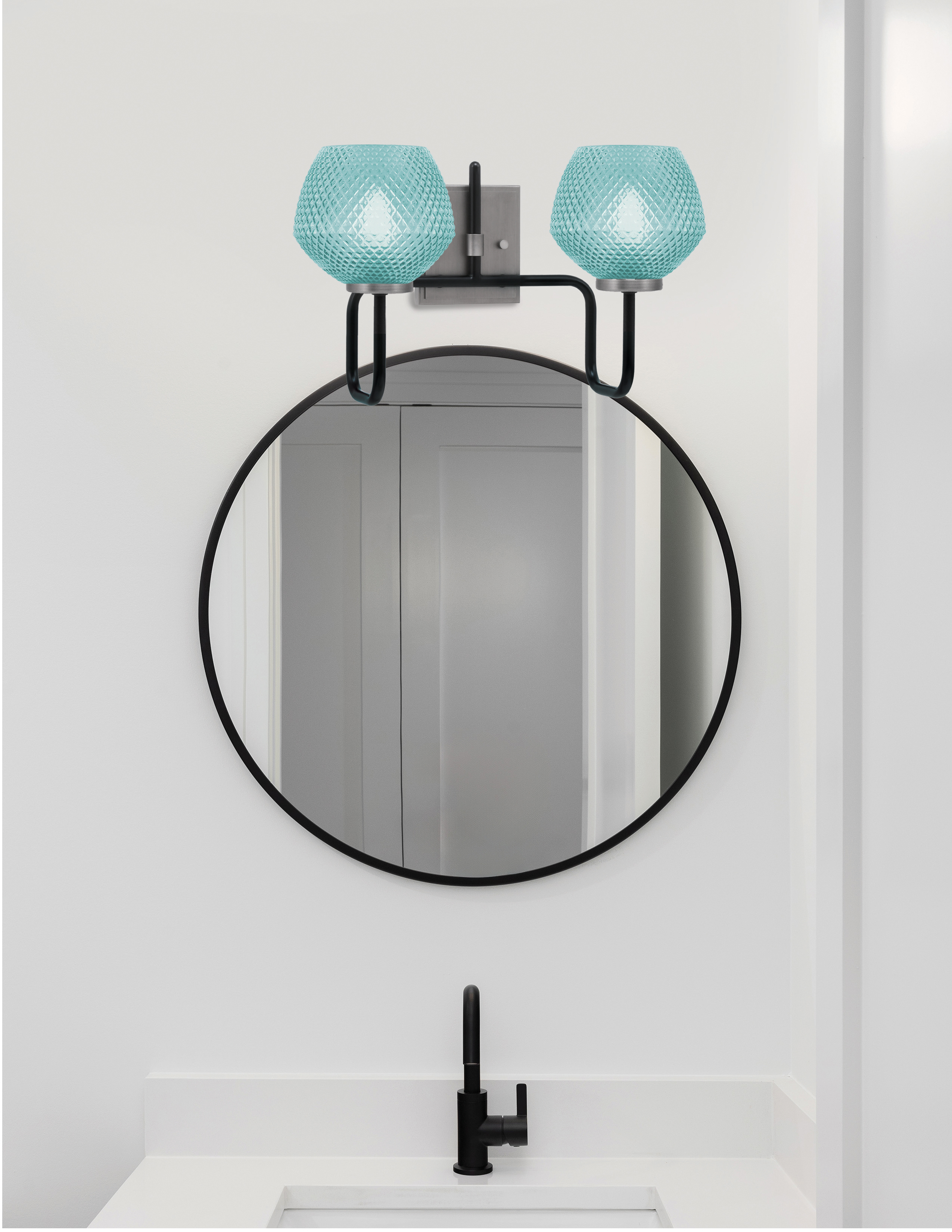 Brighten up your bathroom with the Sandia 2 Light Bath Bar, a stunning fusion of contemporary design and vibrant color. The Matte Black & Graphite finish offers a sleek, industrial look, while the 6″ Turquoise Textured Glass shades provide a refreshing splash of color. Perfect for modern bathrooms, vanity areas, or powder rooms, this bath bar combines aesthetic appeal with practical illumination.