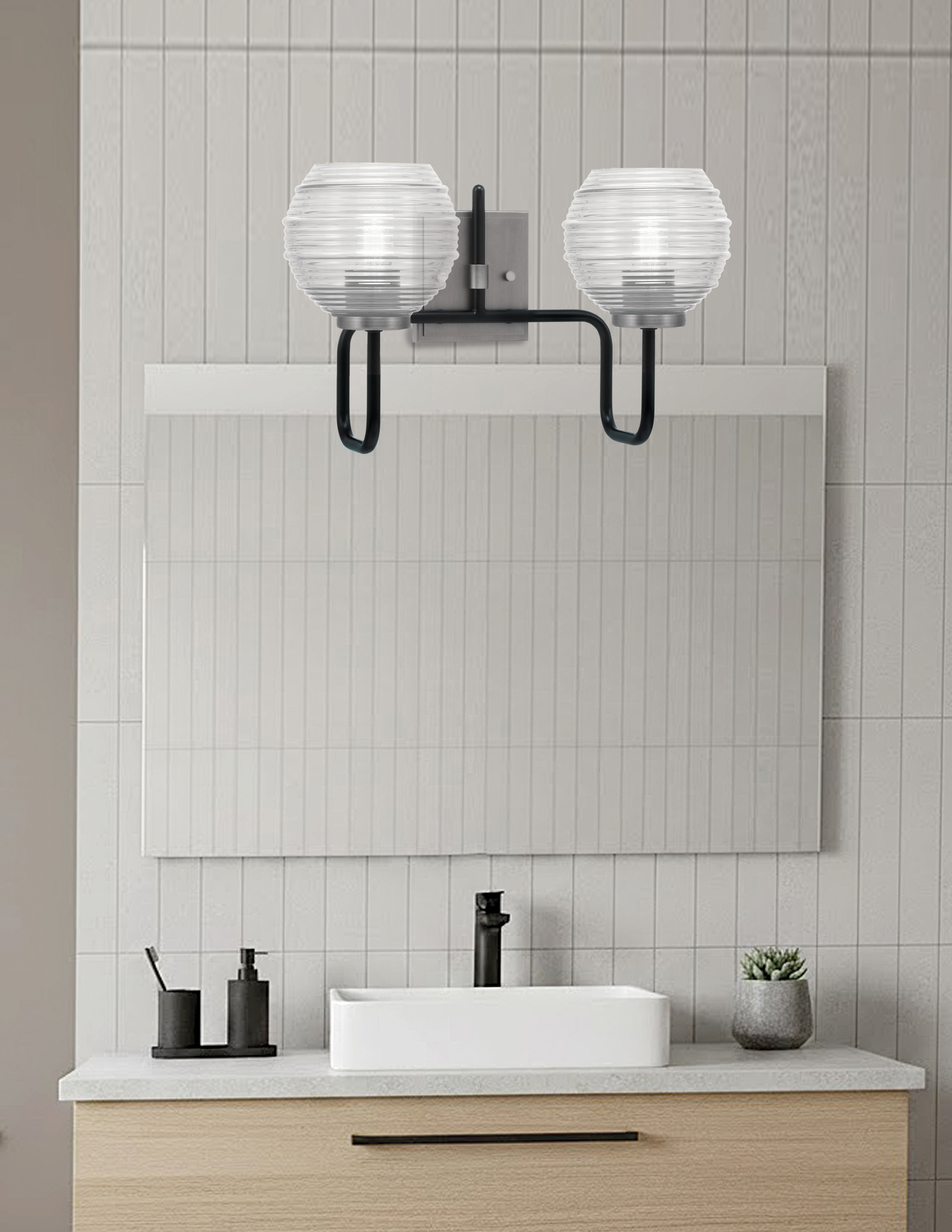 Enhance the beauty of your bathroom with the Sandia 2 Light Bath Bar, featuring a sleek Matte Black & Graphite finish and stunning 6″ Clear Ribbed Glass shades. The ribbed texture of the glass adds a classic touch, diffusing light beautifully. This bath bar brings style and practicality together, making it a perfect addition to any space.