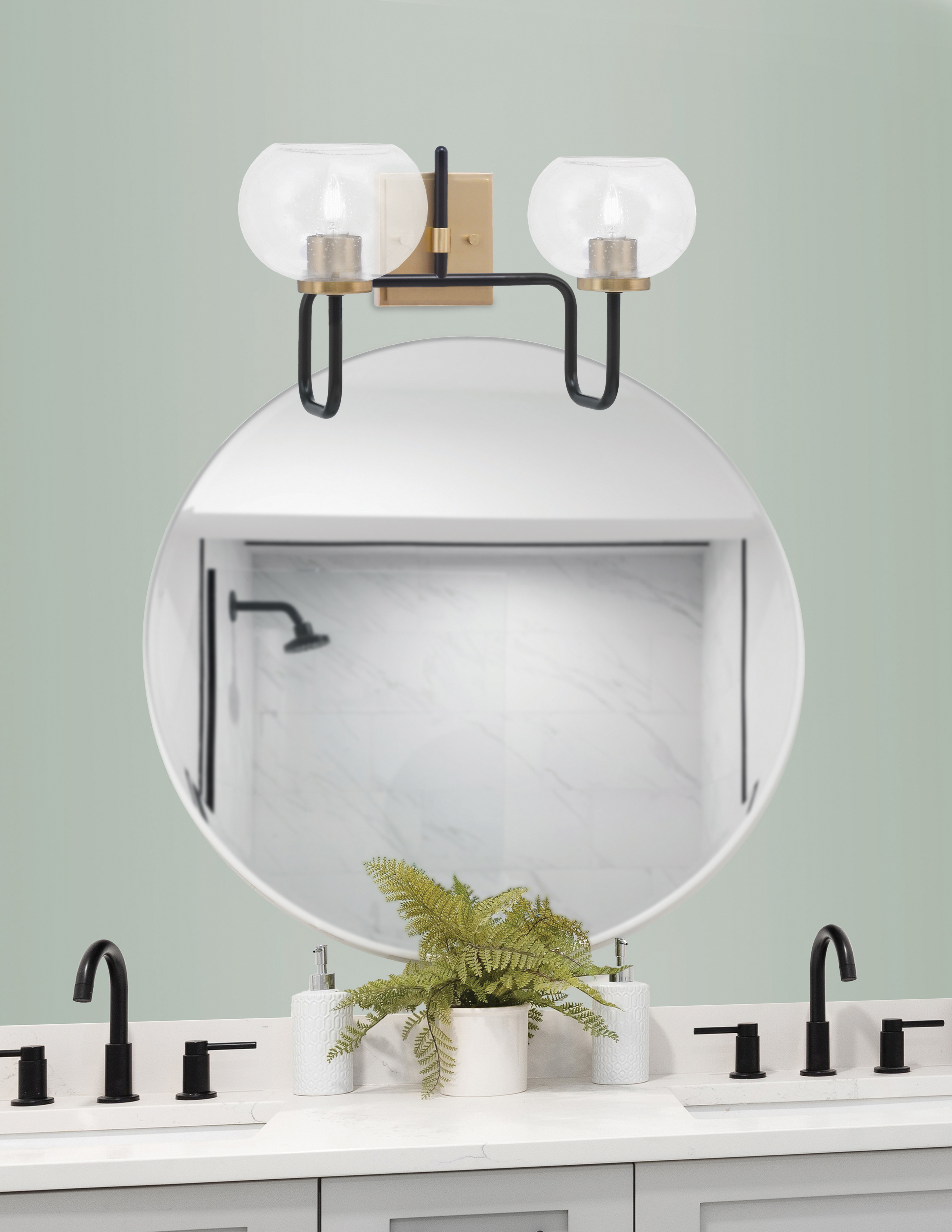 The Sandia 2 Light Bath Bar in Matte Black & New Age Brass Finish with 7″ Clear Bubble Glass Shades brings a sophisticated touch to any bathroom space. The striking contrast of matte black and warm brass adds a contemporary flair, while the clear bubble glass diffuses light beautifully, creating a soft glow. Perfect for vanities, this fixture enhances both modern and transitional interiors.