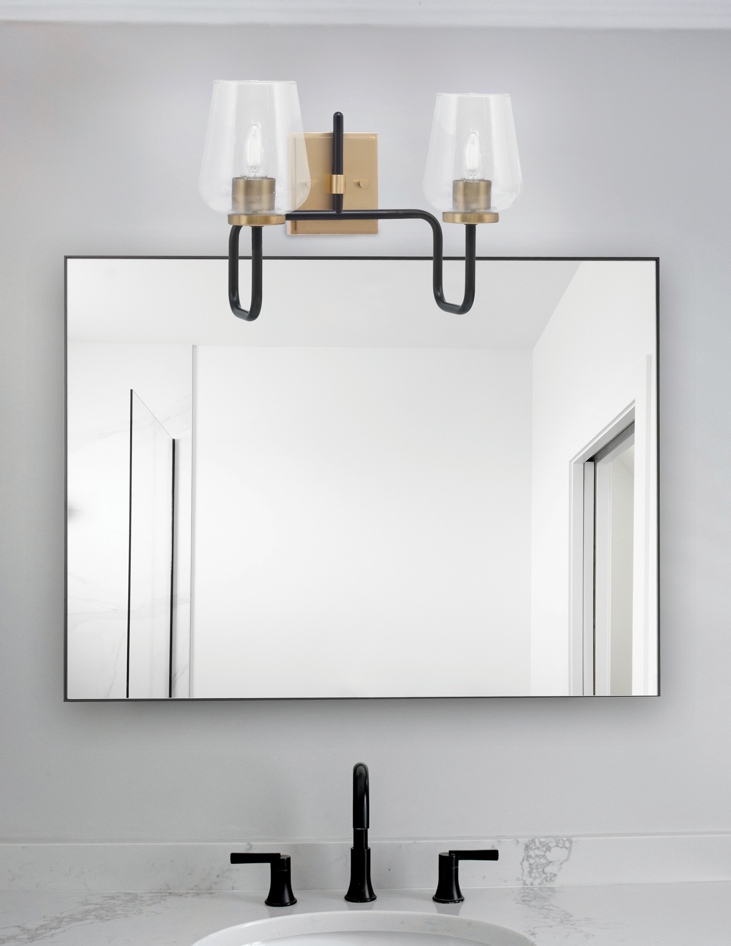 Upgrade your vanity space with the Sandia 2 Light Bath Bar in a Matte Black & New Age Brass Finish with 5″ Clear Bubble Glass Shades. The compact bubble glass enhances the light’s brilliance, creating a dazzling effect. Ideal for contemporary, industrial, and transitional bathrooms.