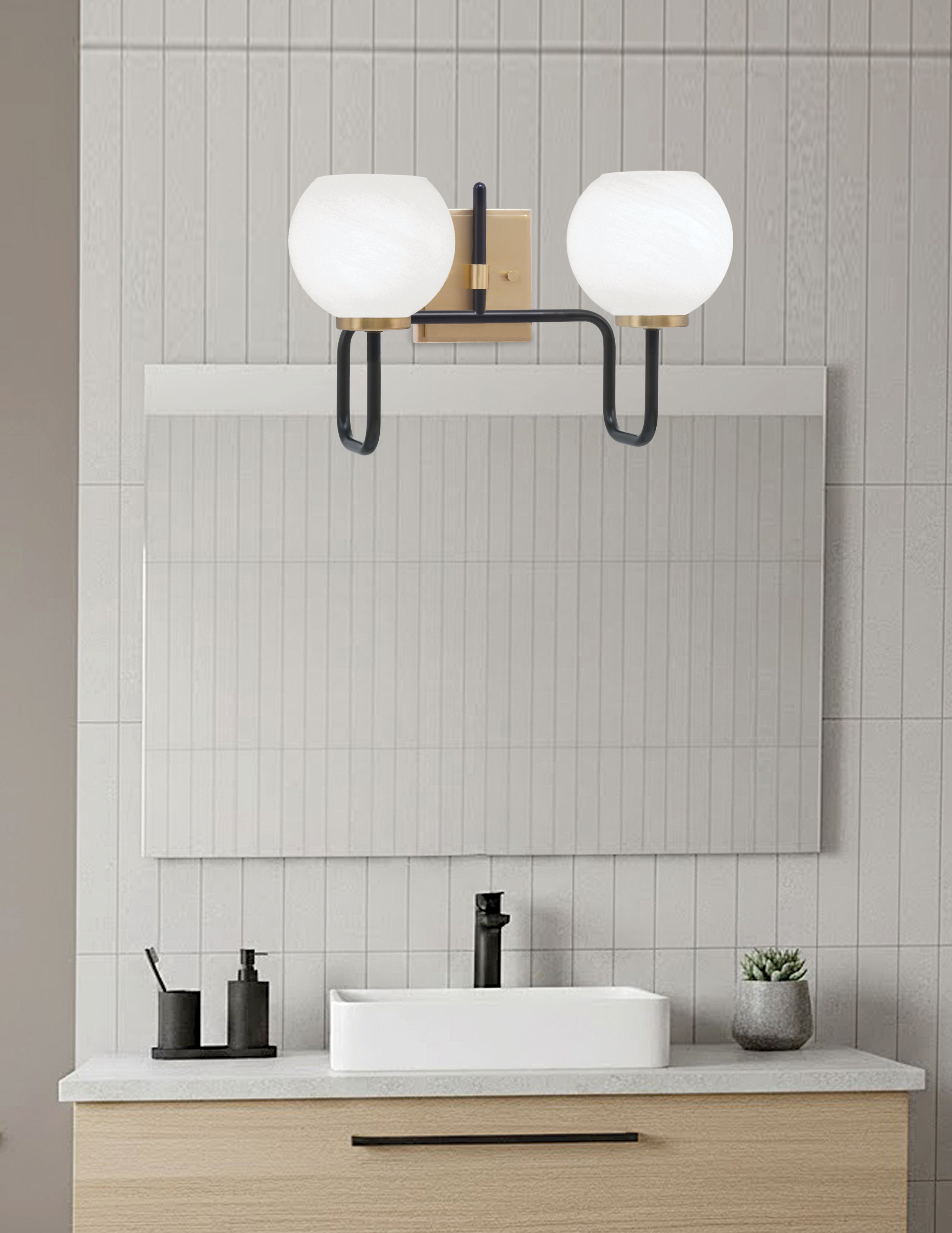 Add a touch of refined elegance to your bathroom with the Sandia 2-Light Bath Bar. The Matte Black & New Age Brass Finish creates a striking contrast, offering a modern yet timeless appeal. Featuring 5.75″ White Marble Glass shades, this fixture provides a soft, diffused glow.