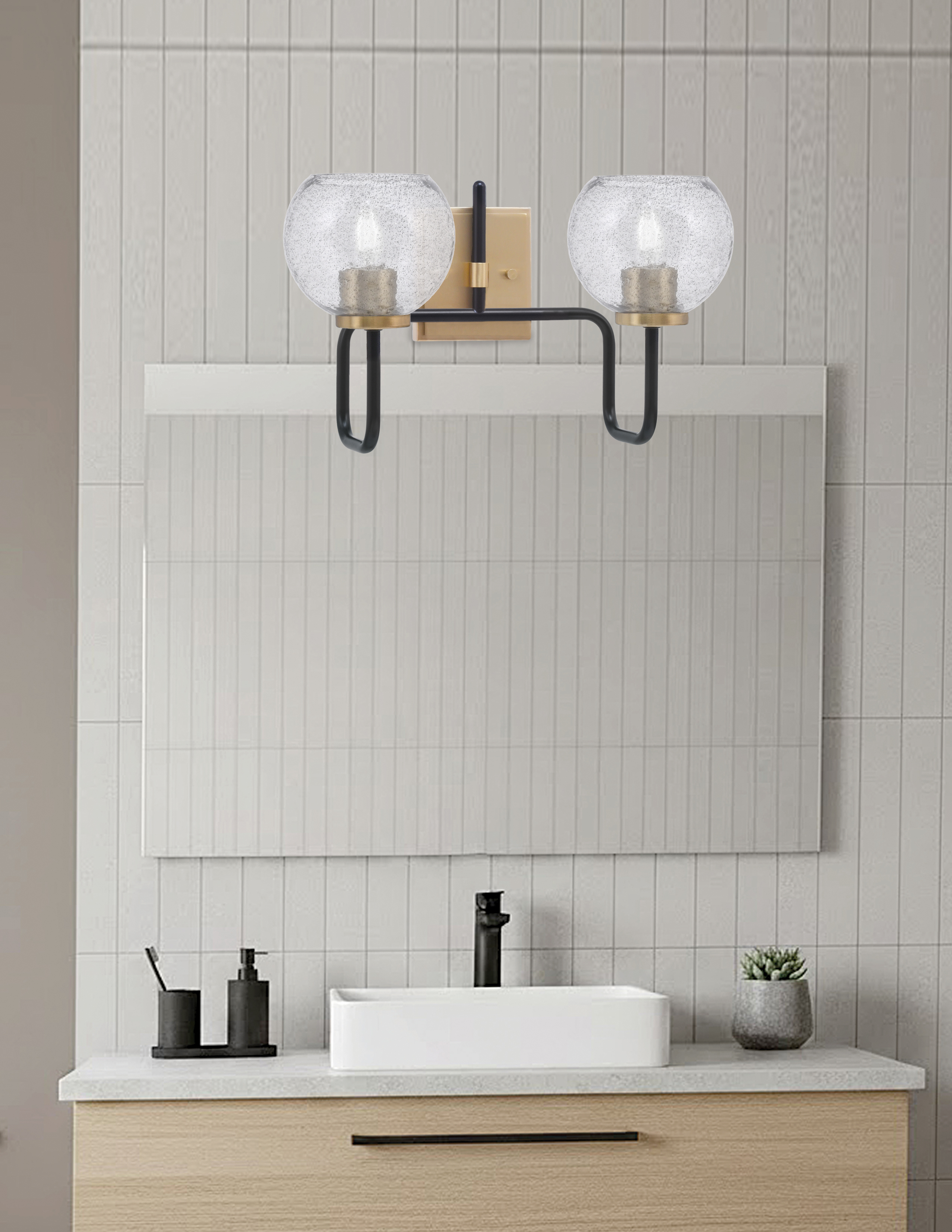 Elevate your bathroom with the sleek and sophisticated Sandia 2-Light Bath Bar. Its Matte Black & New Age Brass Finish delivers a striking contrast, blending modern elegance with timeless appeal. The 5.75″ Smoke Bubble Glass shades add depth and character, featuring a textured surface that beautifully diffuses light for a warm and inviting ambiance.