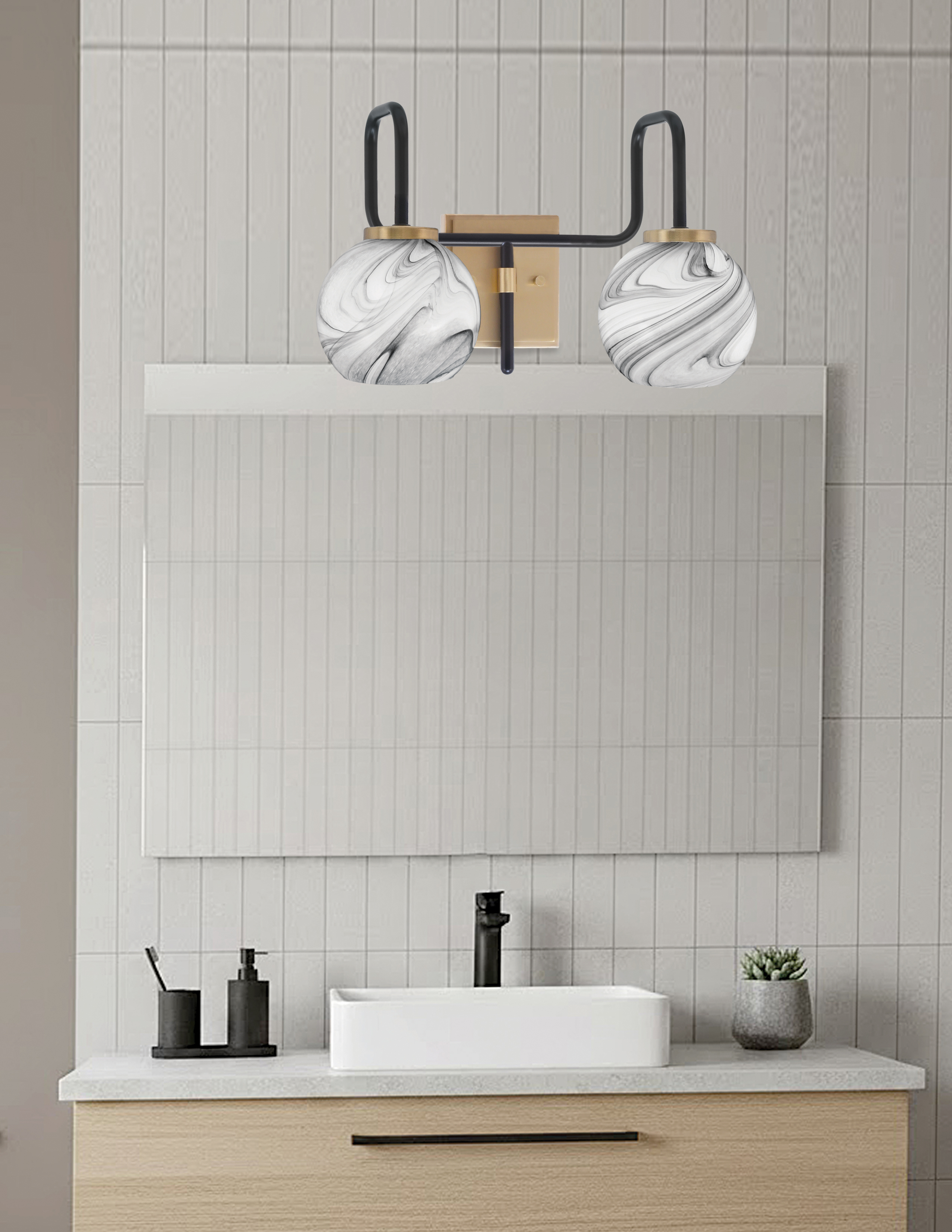 Bring timeless elegance to your bathroom with the Sandia 2 Light Bath Bar, featuring a striking Matte Black & New Age Brass finish. The 5.75″ Onyx Swirl Glass shades add a touch of sophistication with their rich, swirling patterns of black and white, creating a beautifully dynamic visual effect. The fusion of the matte black and brass finish with the bold glass offers a refined yet contemporary look that elevates any modern bathroom.