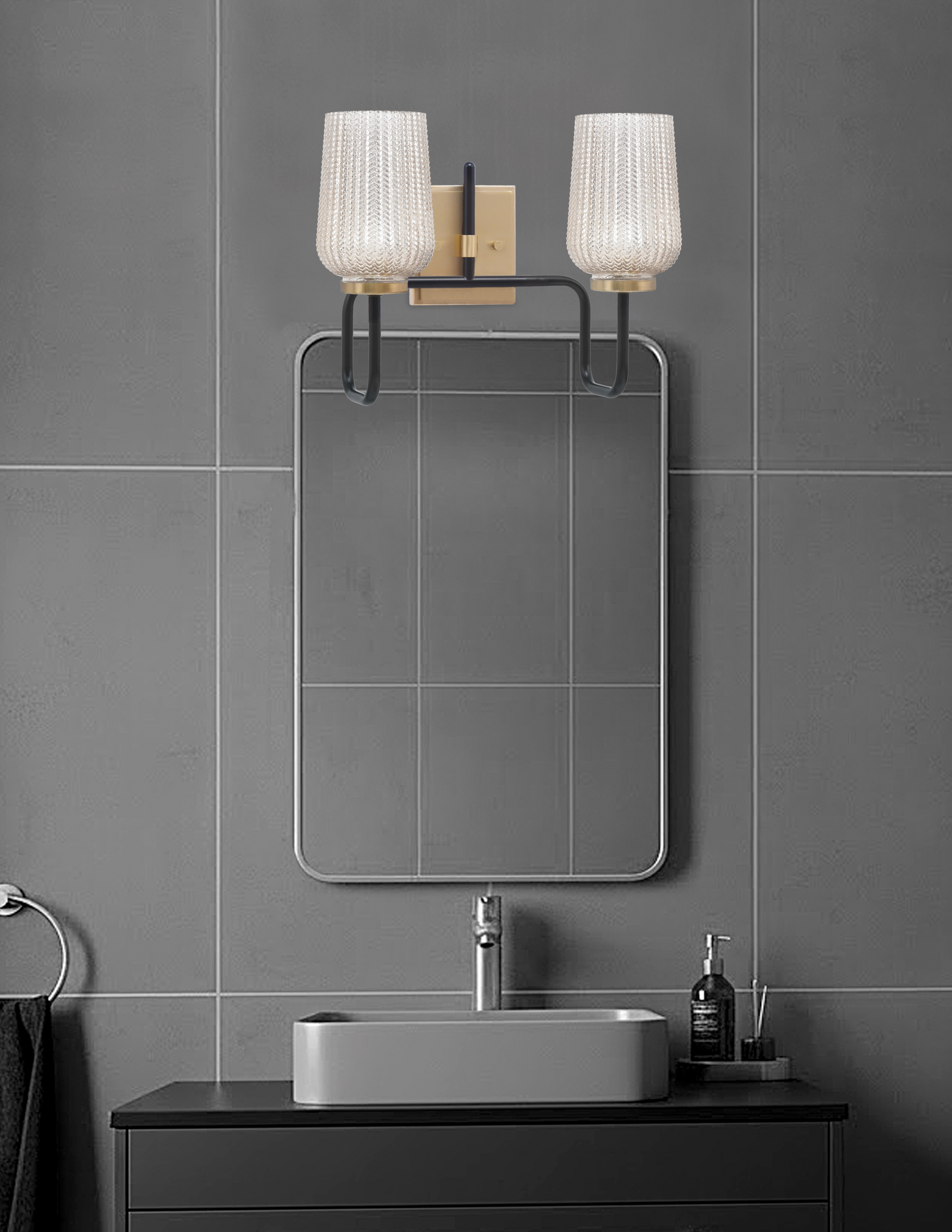 Elevate your bathroom with the sleek, contemporary design of the Sandia 2-Light Bath Bar. The bold Matte Black & New Age Brass Finish creates a striking contrast, offering a modern touch that complements any space. The 5″ Silver Textured Glass shades add a unique shimmer and depth, with their intricate texture refracting light to create a soft, ambient glow.