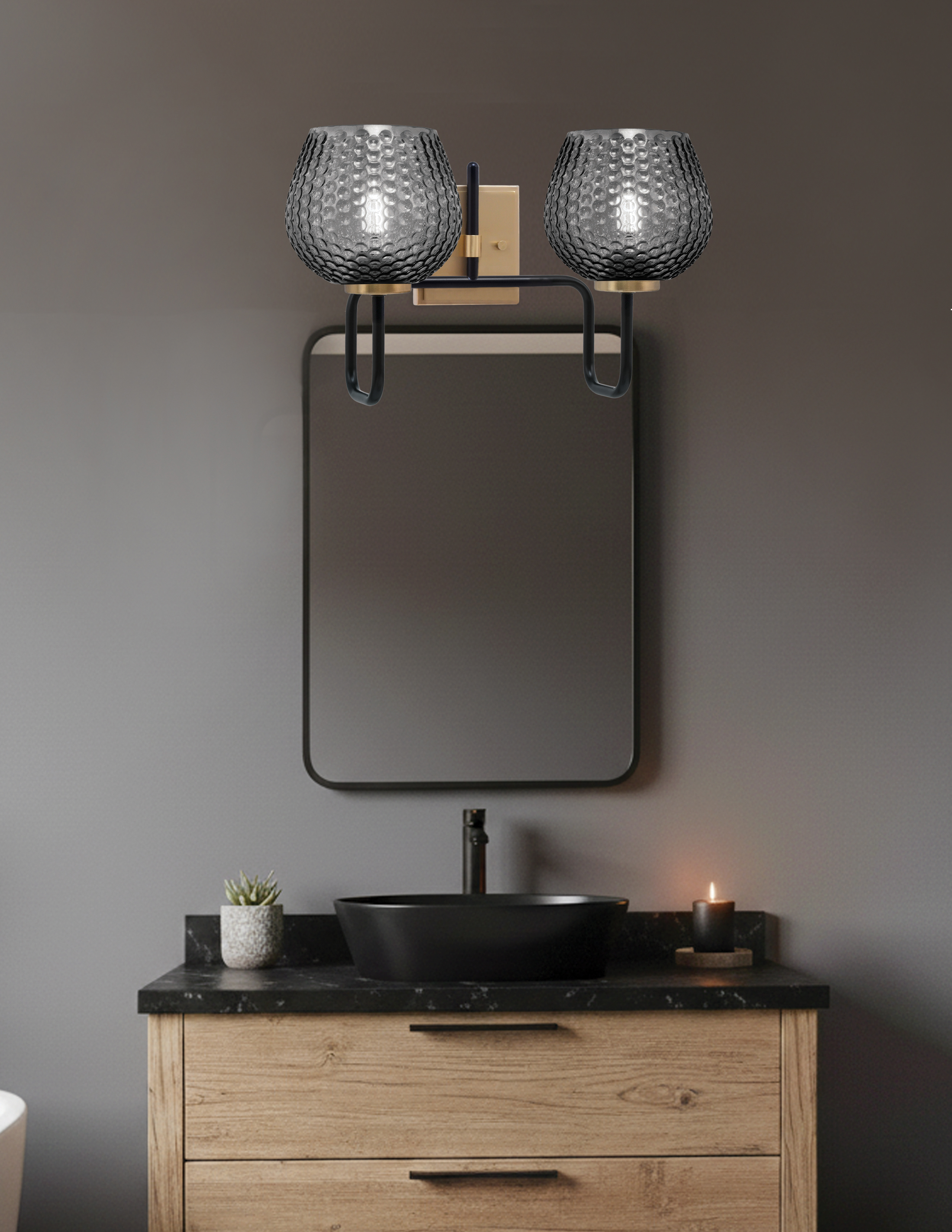 Infuse your bathroom with a touch of modern sophistication and style with the Sandia 2-Light Bath Bar. The striking Matte Black & New Age Brass Finish offers a bold, contemporary contrast, creating a chic focal point. The 6″ Smoke Textured Glass shades introduce a rich, smoky hue paired with a textured surface that diffuses light beautifully, creating a soft and inviting ambiance.