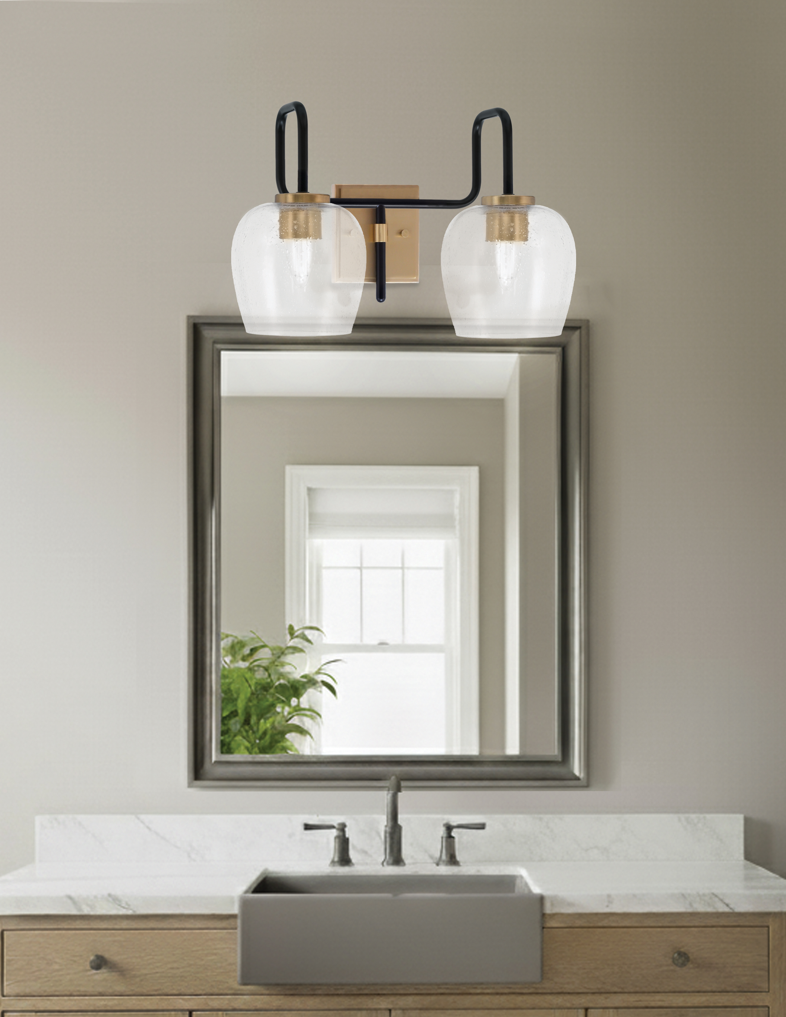 Add a touch of modern sophistication to your bathroom with the Sandia 2-Light Bath Bar. The sleek Matte Black & New Age Brass Finish creates a striking contrast, offering a refined and contemporary look. The 6″ Clear Bubble Glass shades bring a unique texture, capturing light and creating an eye-catching, soft glow throughout your space.