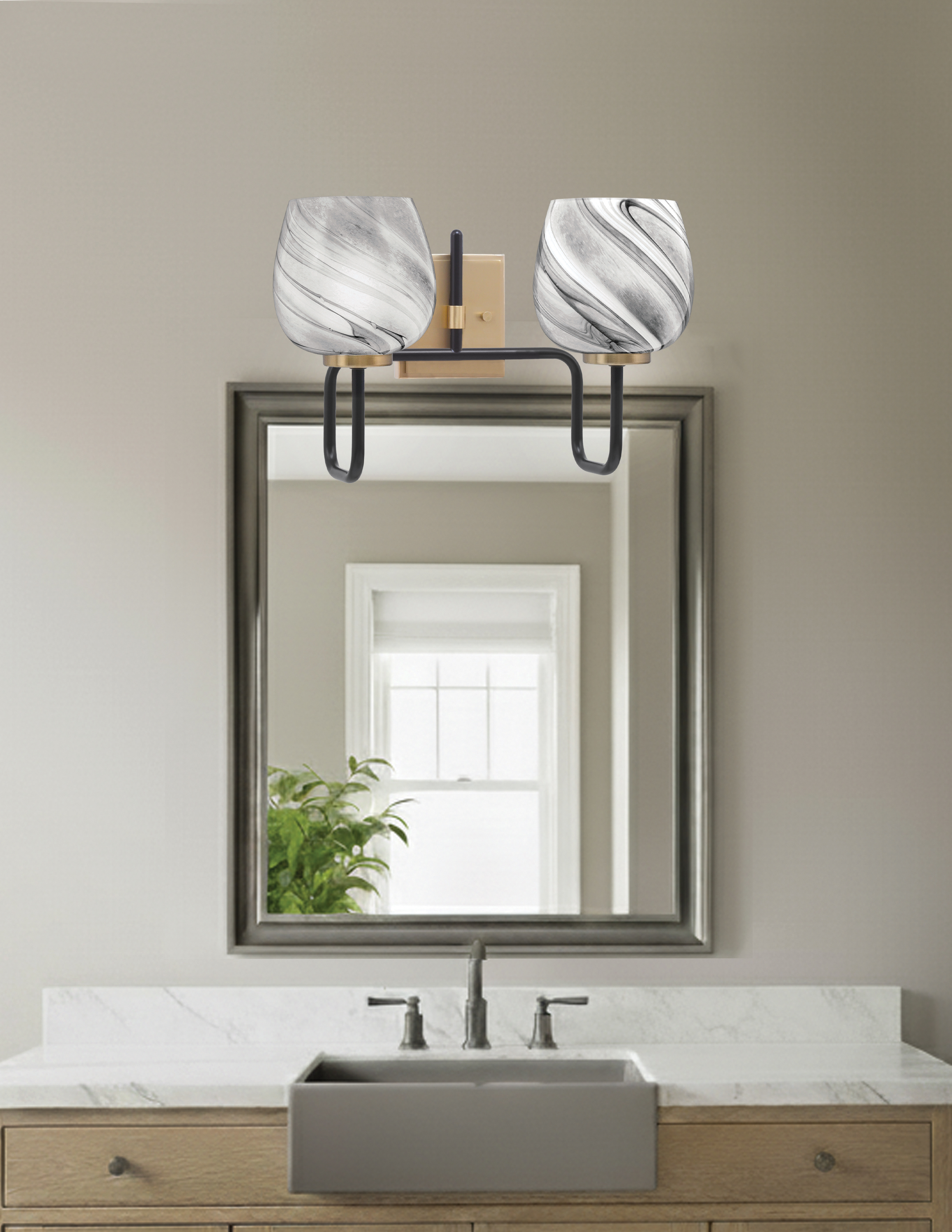Transform your bathroom with the Sandia 2 Light Bath Bar, where modern industrial design meets sophisticated elegance. The Matte Black & New Age Brass finish provides a sleek and stylish base, while the 6″ Onyx Swirl Glass shades introduce a dynamic, artistic touch. The unique onyx swirl design creates a striking focal point, while the blend of matte black and brass accents ensures a refined, luxurious finish.