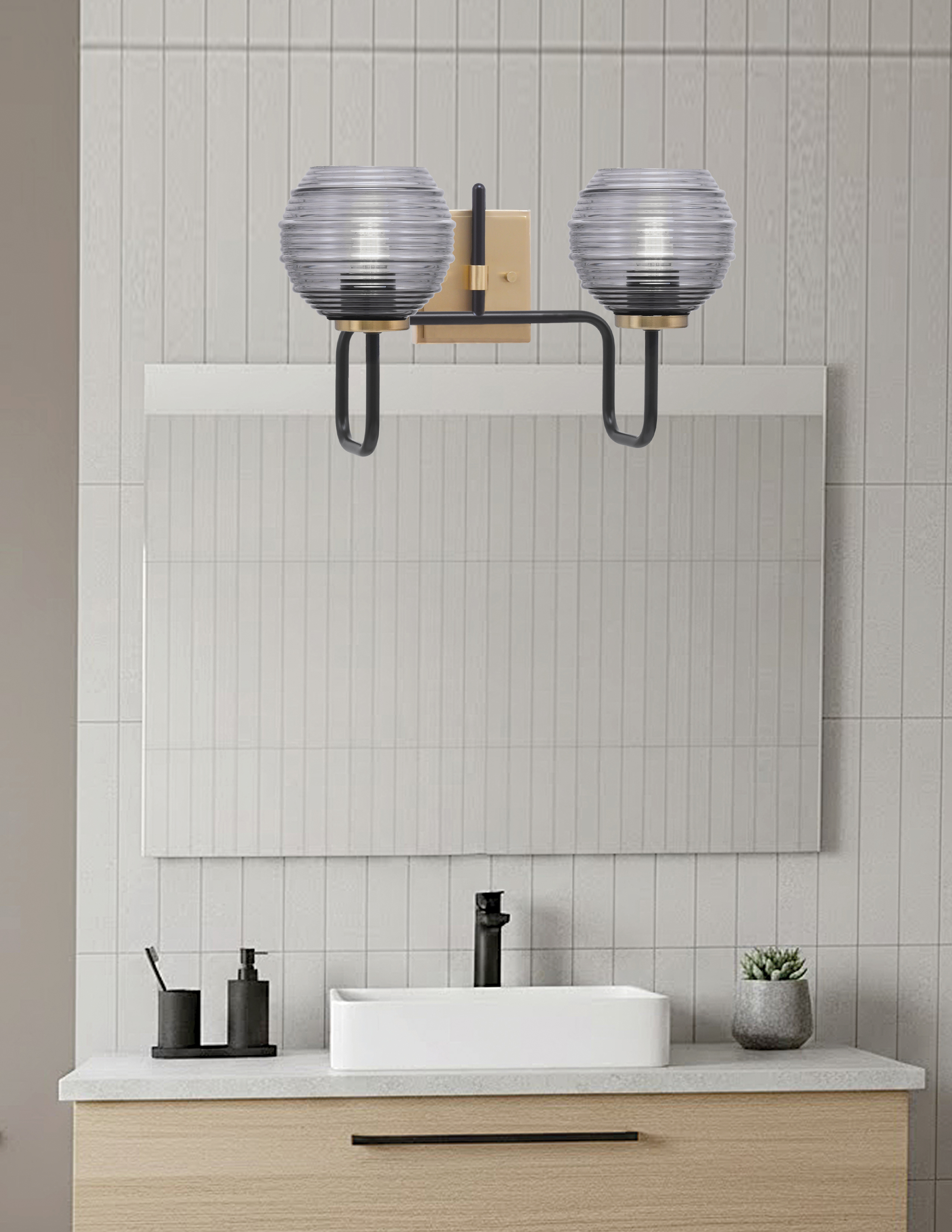 Bring a touch of modern elegance to your bathroom with the Sandia 2-Light Bath Bar. The bold Matte Black & New Age Brass Finish offers a striking contrast, making it a standout piece in any space. The 6″ Smoke Ribbed Glass shades add texture and depth, beautifully refracting light to create a soft, inviting glow with a subtle smoky hue.