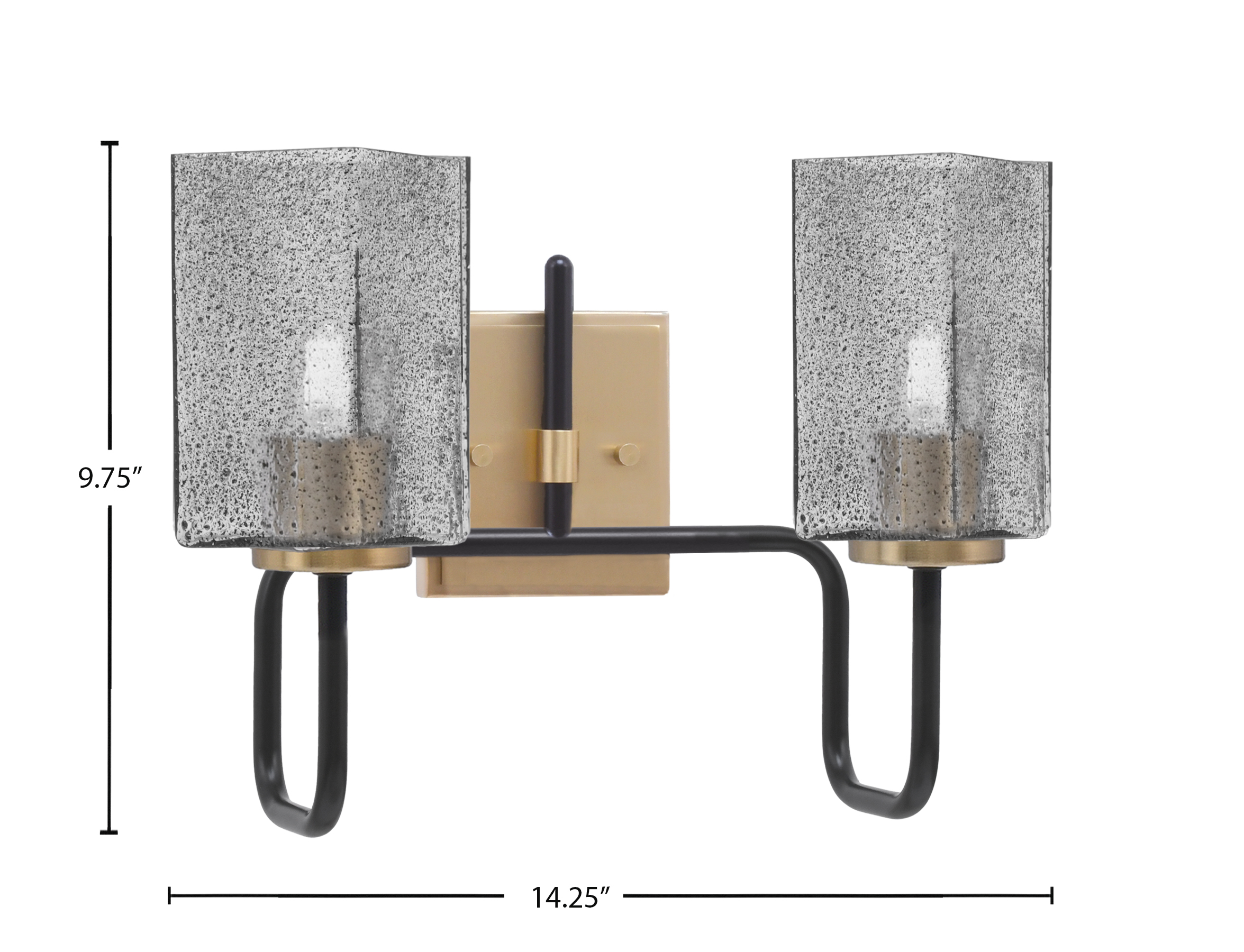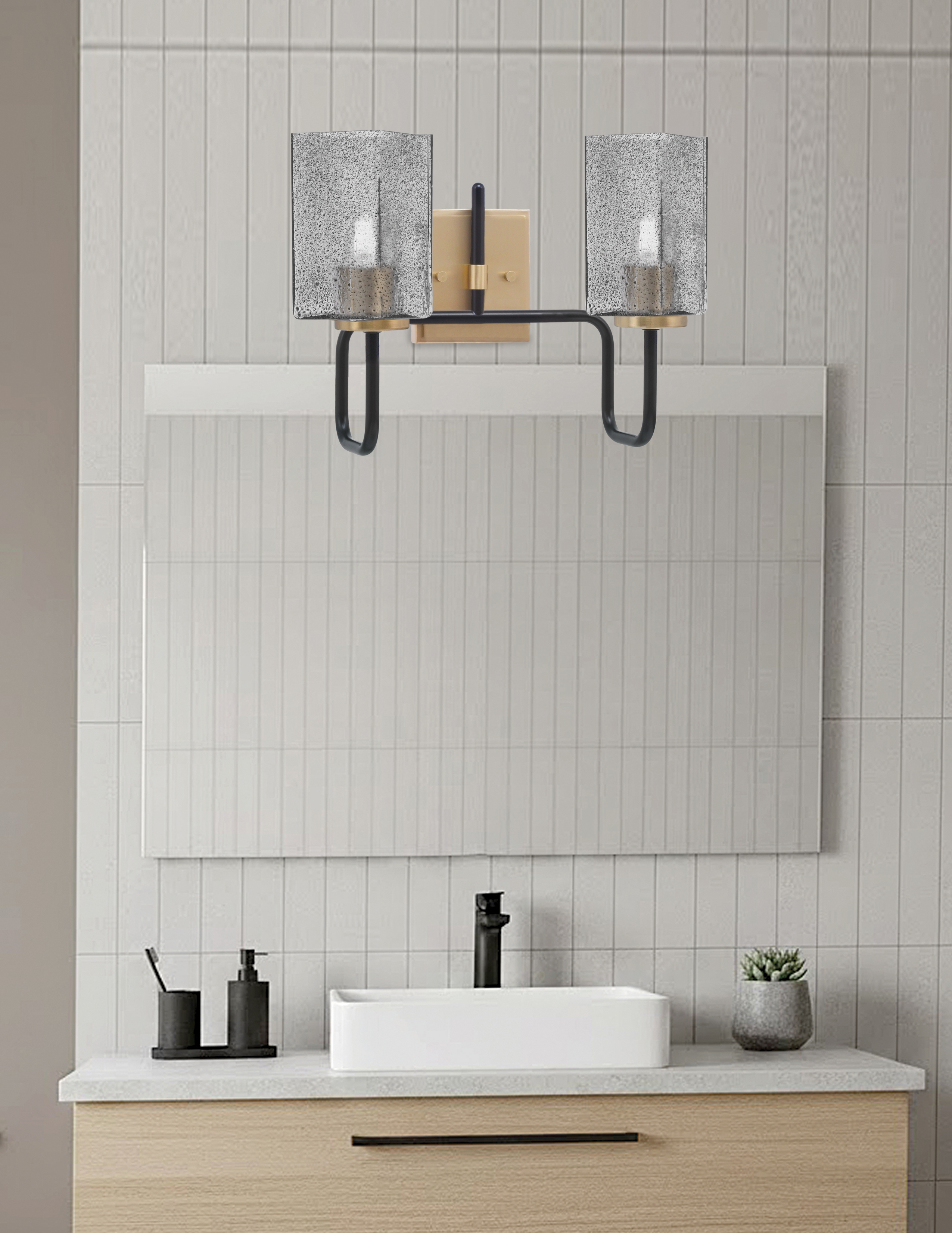 The Sandia 2 Light Bath Bar in Matte Black & New Age Brass Finish delivers a striking visual balance. The 3.5″ Square Smoke Bubble Glass Shades create a stunning interplay of light and shadow. The result is a fixture that enhances your space with a blend of bold structure and soft, diffused light.