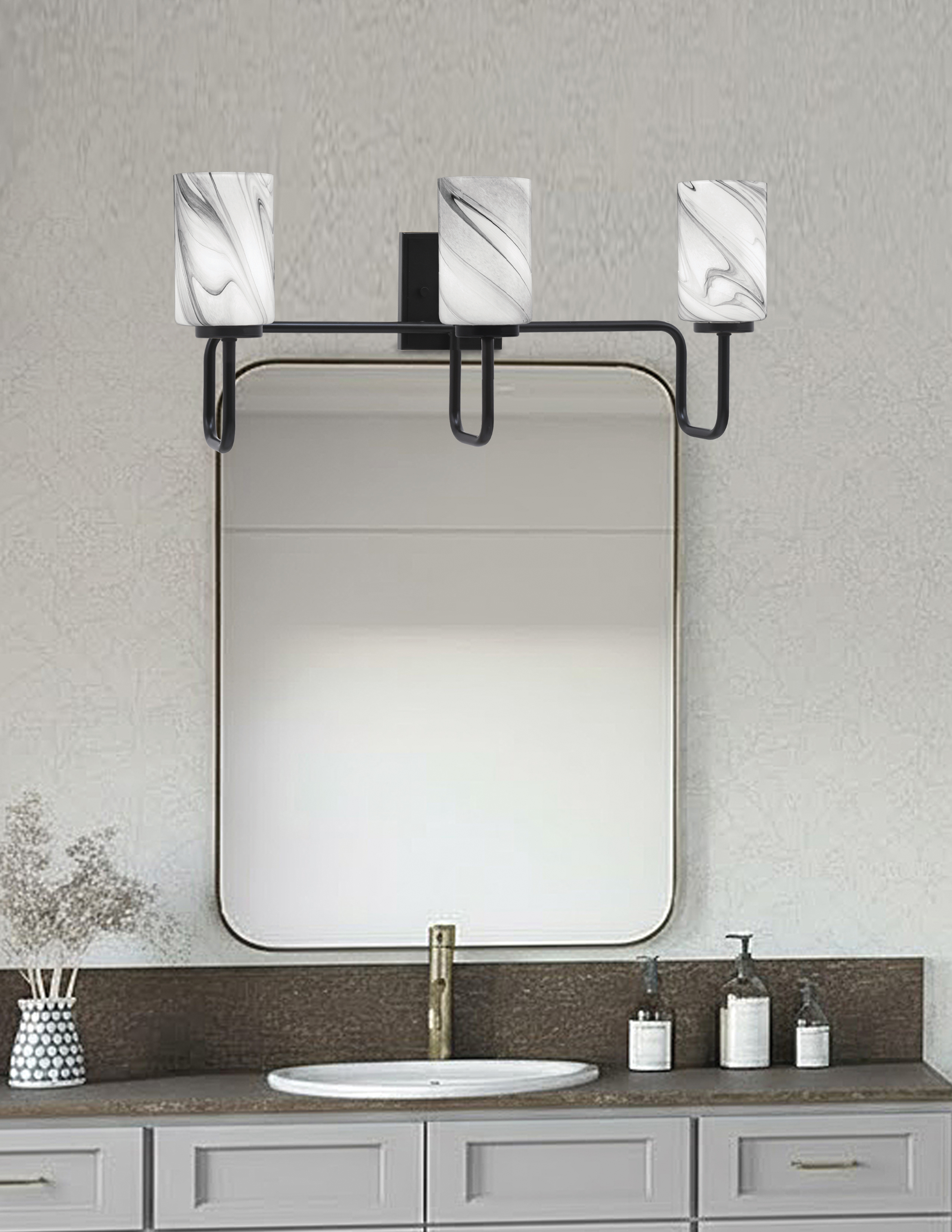 Elevate your bathroom with the striking Sandia 3 Light Bath Bar. Featuring a sophisticated Matte Black finish, this fixture is paired with 4″ Onyx Swirl Glass shades. This fixture provides both form and function, bringing beauty and illumination to any powder room or bathroom.