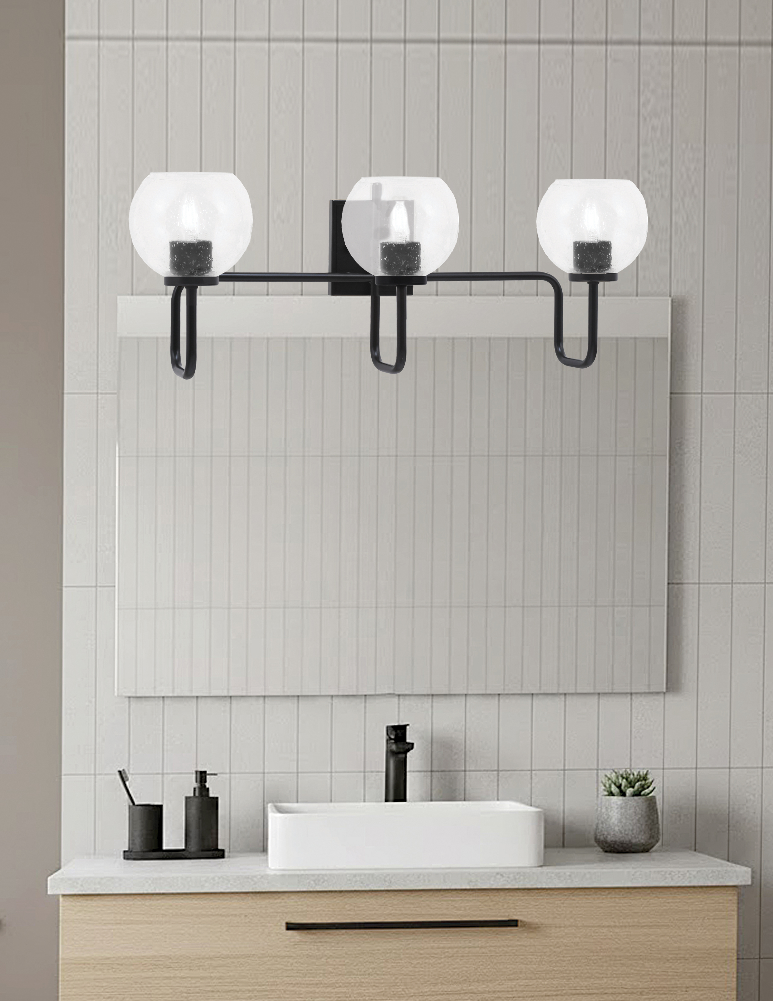 Infuse your bathroom with modern sophistication and elegant design with the Sandia 3 Light Bath Bar. Featuring a striking Matte Black finish, this fixture is paired with 5.75″ Clear Bubble Glass shades that add both texture and visual interest. Perfect for contemporary, transitional, and industrial-inspired spaces, the Sandia bath bar seamlessly combines sleek aesthetics with functionality.
