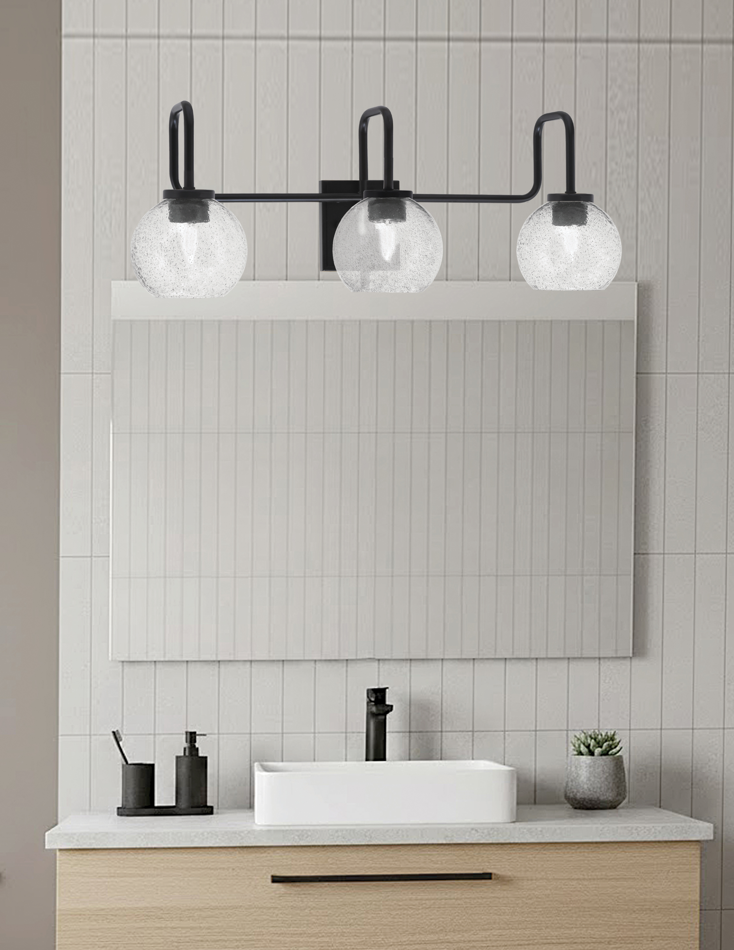 Add a touch of modern luxury to your bathroom with the Sandia 3 Light Bath Bar. Featuring a sleek Matte Black finish, this fixture is complemented by 5.75″ Smoke Bubble Glass shades that offer a captivating blend of texture and color. With its minimalist design and unique glass shades, the Sandia bath bar effortlessly enhances both contemporary and industrial-inspired interiors.