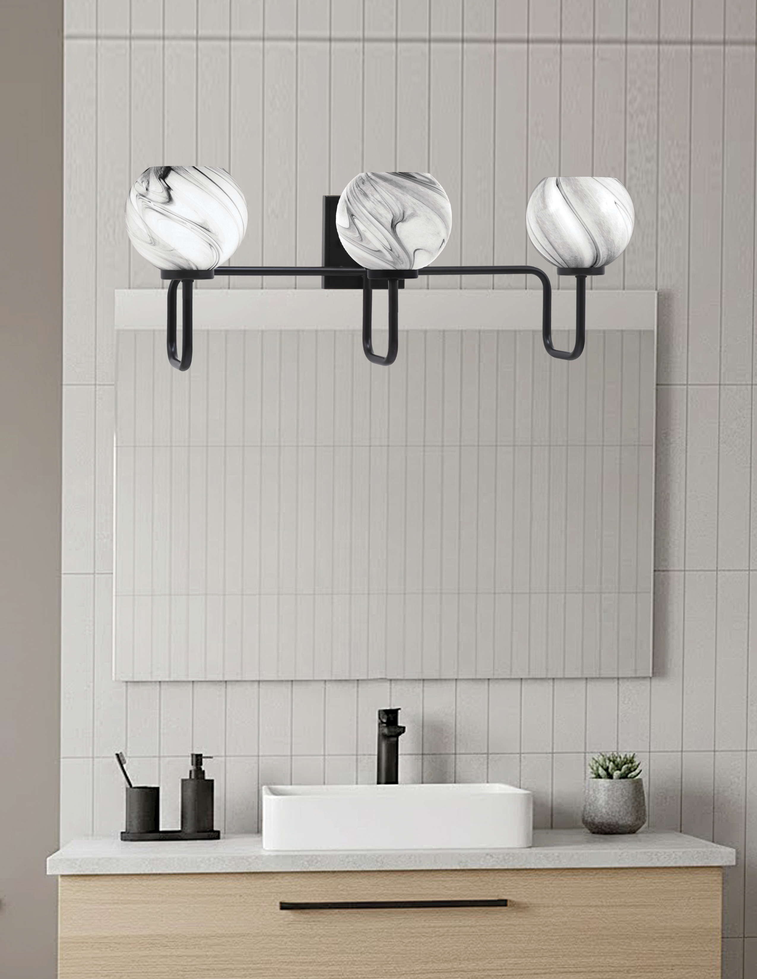 Enhance your bathroom with the luxurious Sandia 3 Light Bath Bar, featuring a bold Matte Black finish and stunning 5.75″ Onyx Swirl Glass shades. The distinctive swirl design in the onyx glass creates a unique, dynamic texture, making this fixture a standout addition to any modern or transitional space. Ideal for enhancing the style and ambiance of your bathroom or powder room.