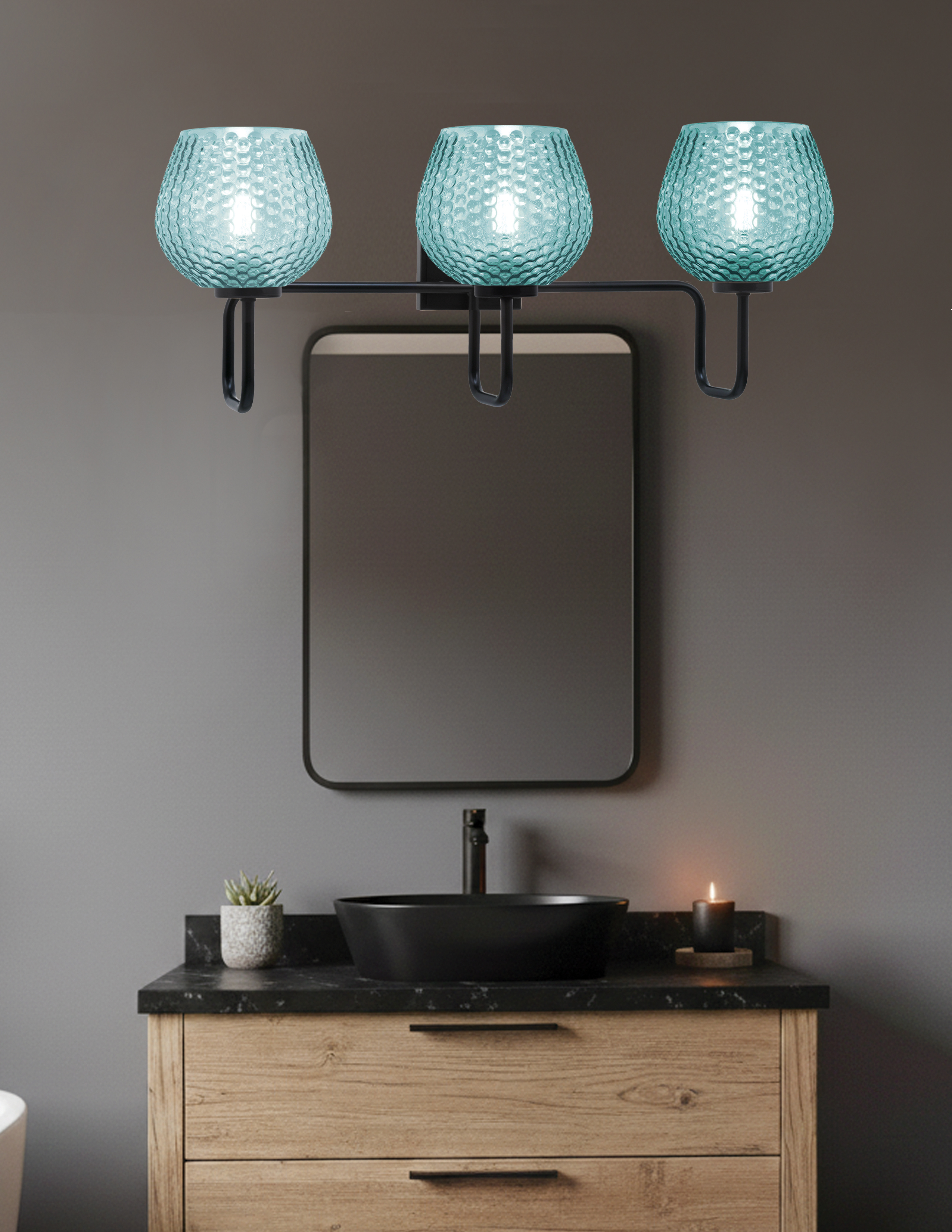 Add a vibrant, contemporary touch to your bathroom with the Sandia 3 Light Bath Bar. Featuring a striking Matte Black finish, this fixture is beautifully complemented by 6″ Turquoise Textured Glass shades, creating a stunning contrast that brightens any space. With its sleek, minimalist design, the Sandia bath bar is perfect for modern and transitional bathrooms.