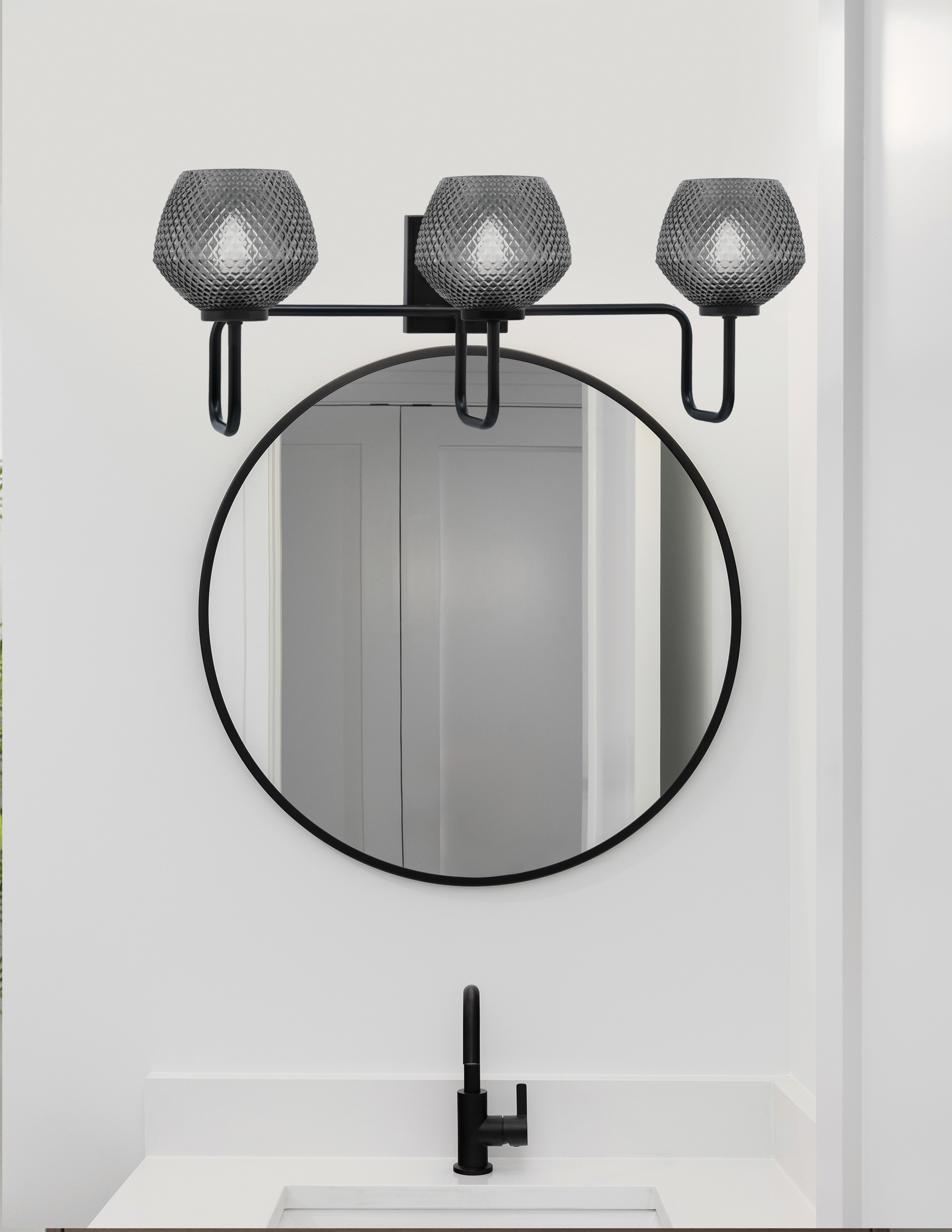 Create a relaxed, sophisticated atmosphere with the Sandia 3 Light Bath Bar. The Matte Black finish enhances the elegance of the 6″ Smoke Textured Glass shades, offering a perfect balance of function and style. The smoked glass softly filters light, making this fixture ideal for creating a tranquil ambiance in your bathroom or powder room.