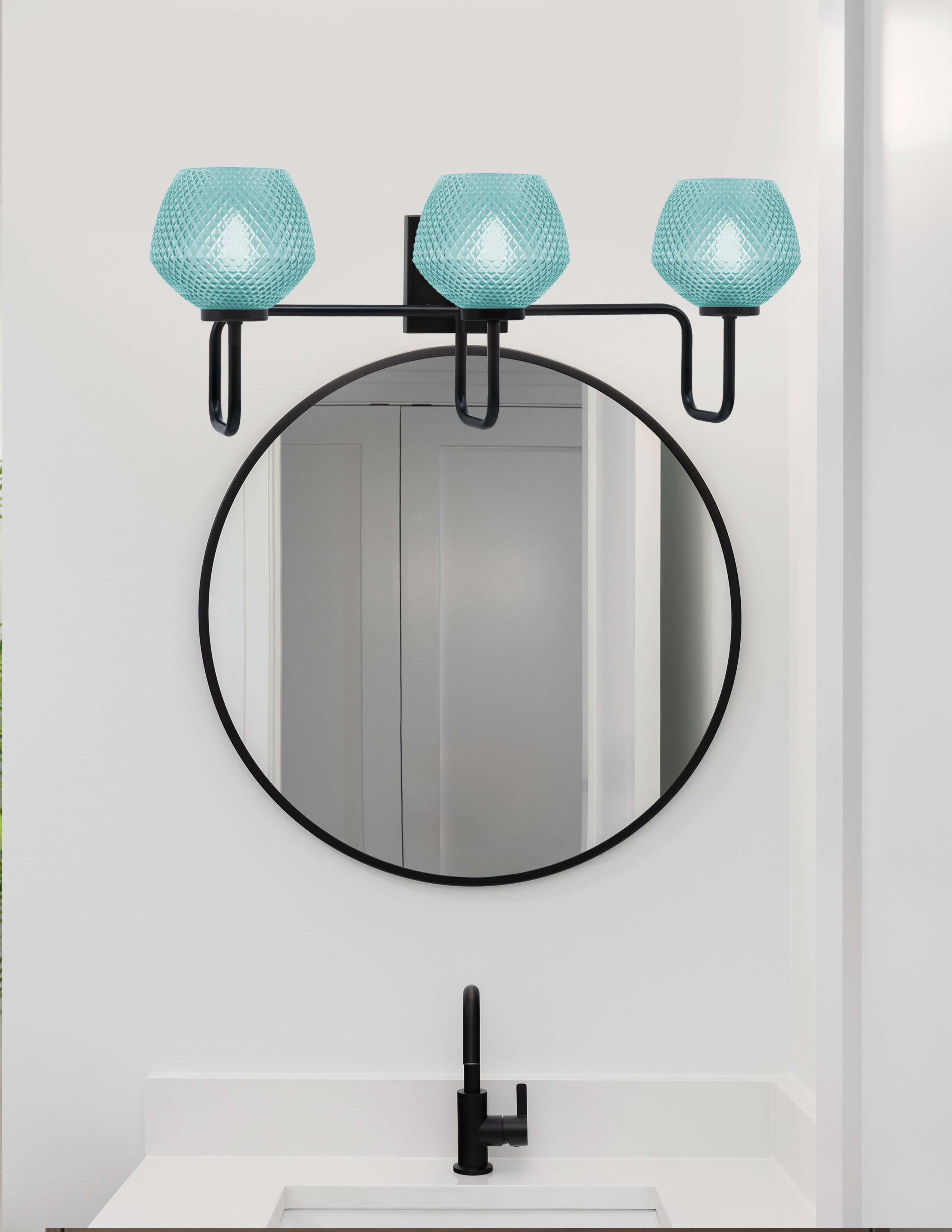 The Sandia 3 Light Bath Bar is a bold addition to your bathroom, combining a striking Matte Black finish with the vibrant 6″ Turquoise Textured Glass shades. The turquoise glass provides a soft, yet colorful light, creating an uplifting atmosphere. The matte black finish anchors the design, making it a perfect choice for contemporary and artistic spaces.