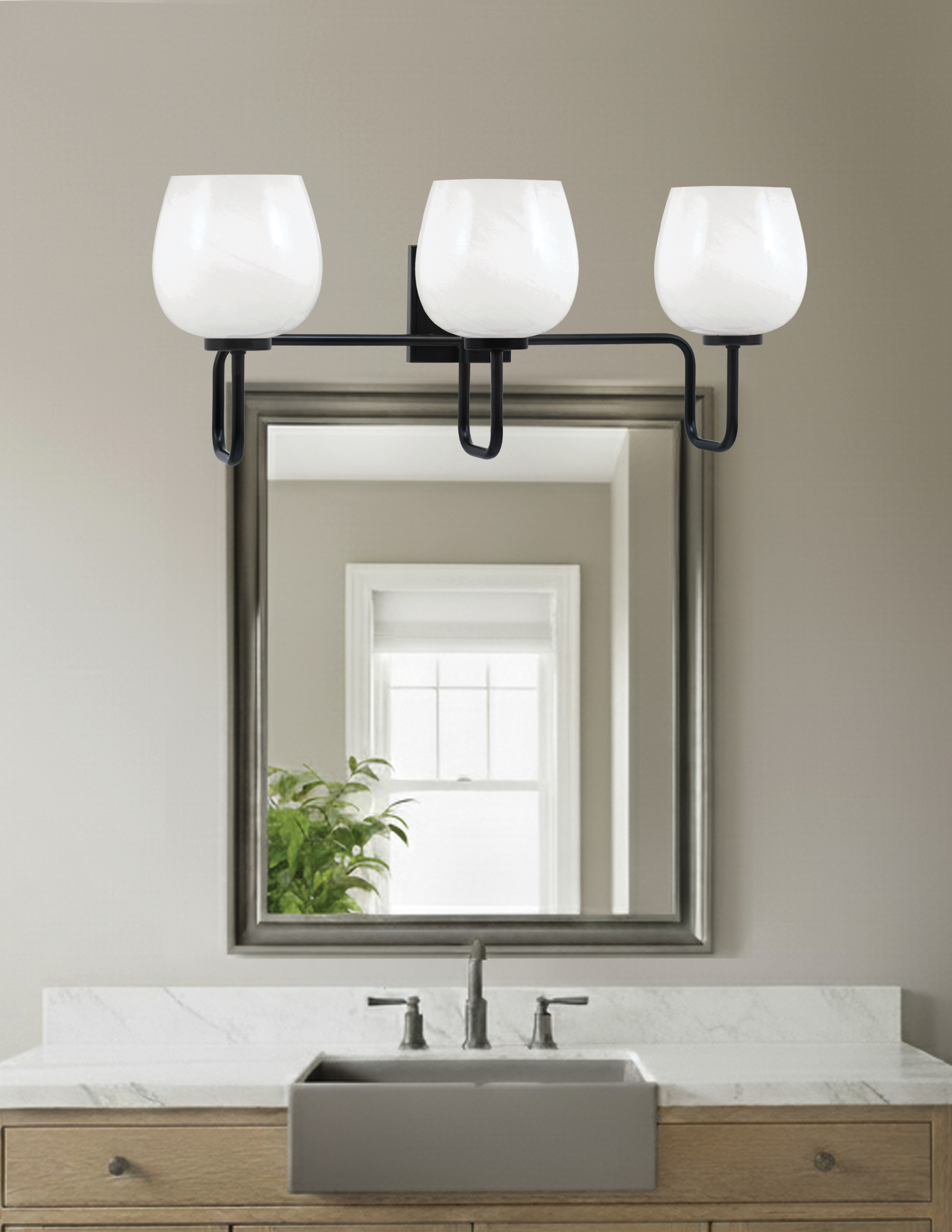 Elevate your bathroom with the Sandia 3 Light Bath Bar, featuring sophisticated 6″ White Marble Glass shades that add a touch of luxury and refinement. The unique white marble glass provides soft, diffused light, creating a calming and elegant atmosphere. Paired with a sleek Matte Black finish, this fixture is perfect for modern bathrooms or vanity areas.
