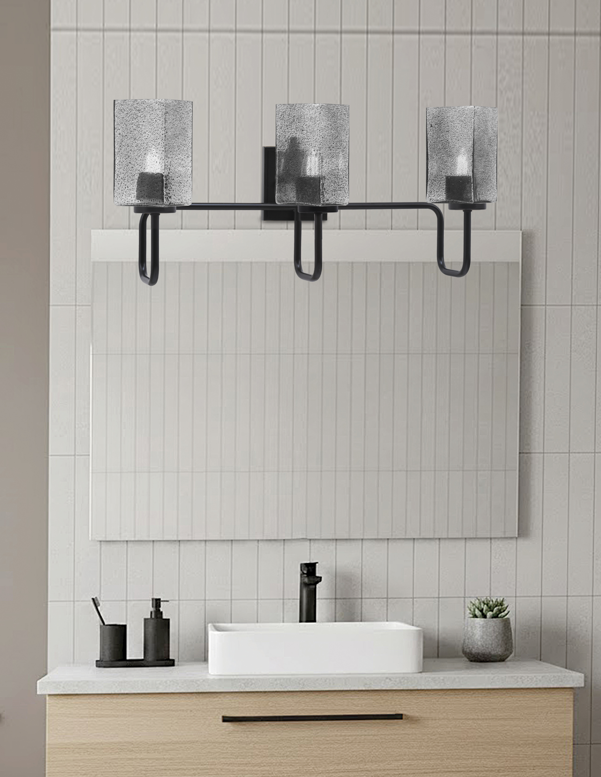 Bring a modern, industrial flair to your bathroom with the Sandia 3 Light Bath Bar. This stunning fixture features a Matte Black finish that contrasts beautifully with the 3.5″ Square Smoke Bubble Glass shades. The unique bubble texture within the smoke-colored glass not only adds visual interest but also softens the light. This fixture delivers both functional lighting and a touch of sophistication.