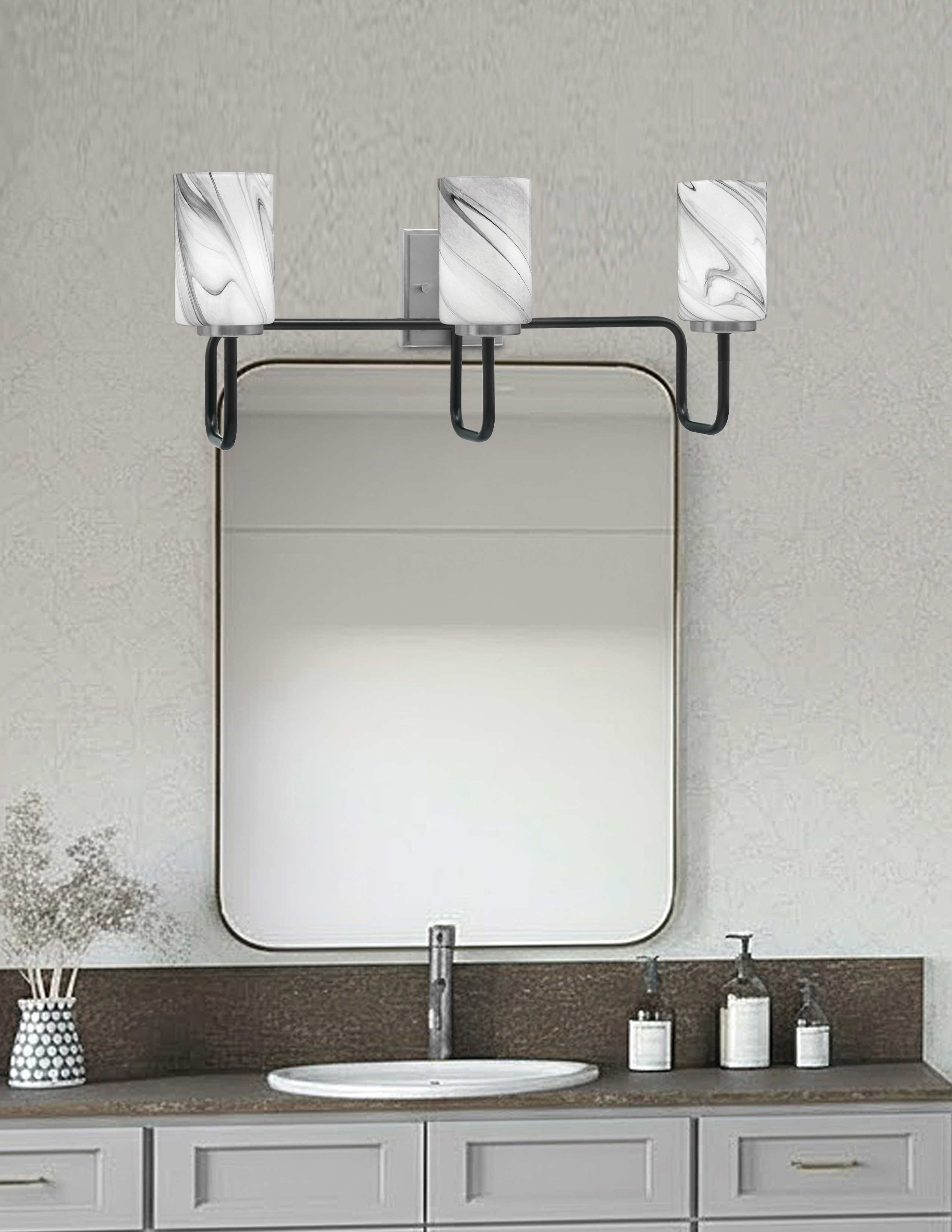 Bring a touch of elegance and sophistication to your bathroom with the Sandia 3 Light Bath Bar. Featuring a refined Matte Black & Graphite Finish, this bath bar effortlessly blends modern design with a hint of industrial charm. The 4″ Onyx Swirl Glass shades provide a unique and striking look, with their swirling patterns creating a soft, diffused light that adds ambiance to any space.