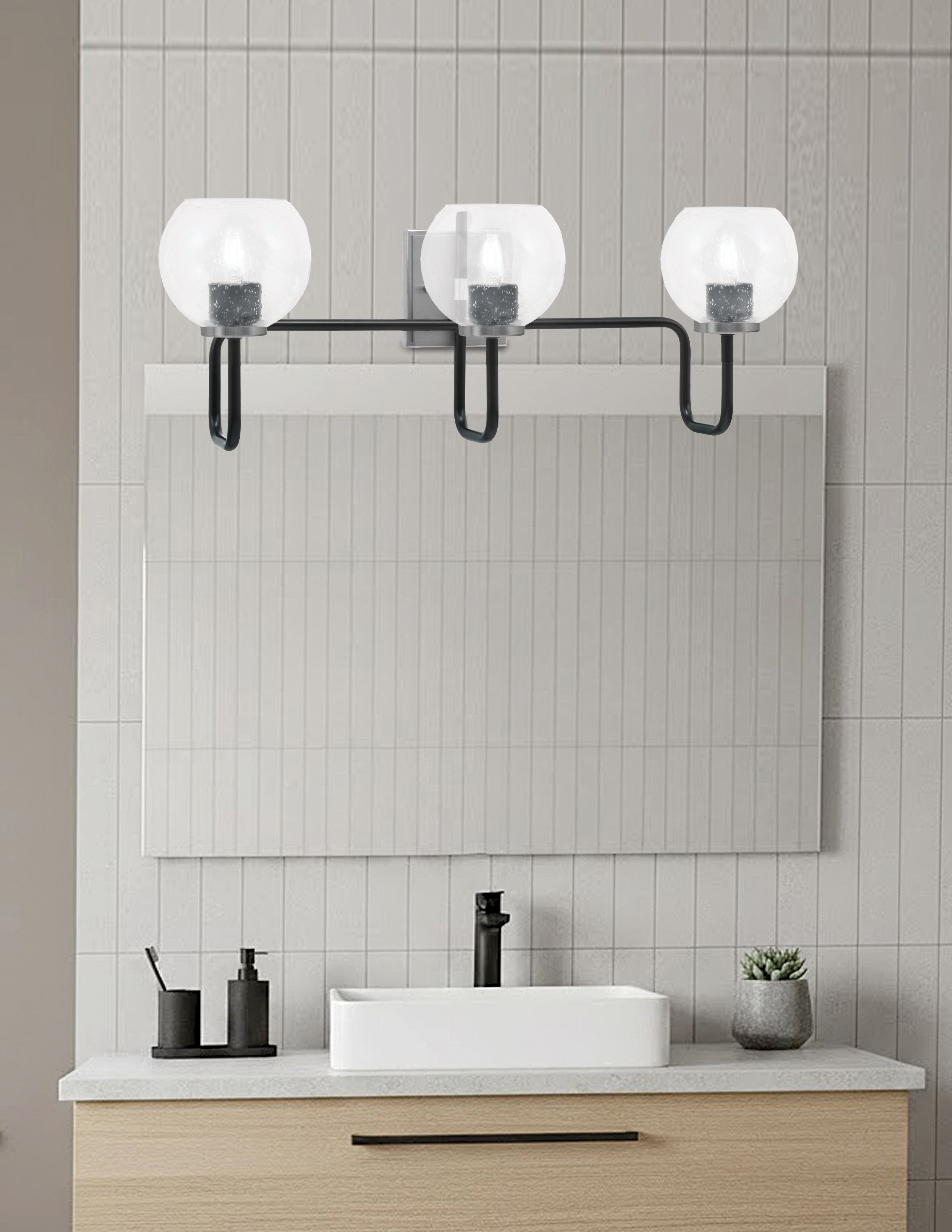 Elevate your bathroom”s ambiance with the Sandia 3 Light Bath Bar, featuring a striking Matte Black & Graphite Finish and a modern design. The 5.75″ Clear Bubble Glass shades add a touch of texture and elegance, capturing light in a way that creates a soft, inviting glow. This fixture is perfect for adding both functionality and style to your vanity or bathroom space.
