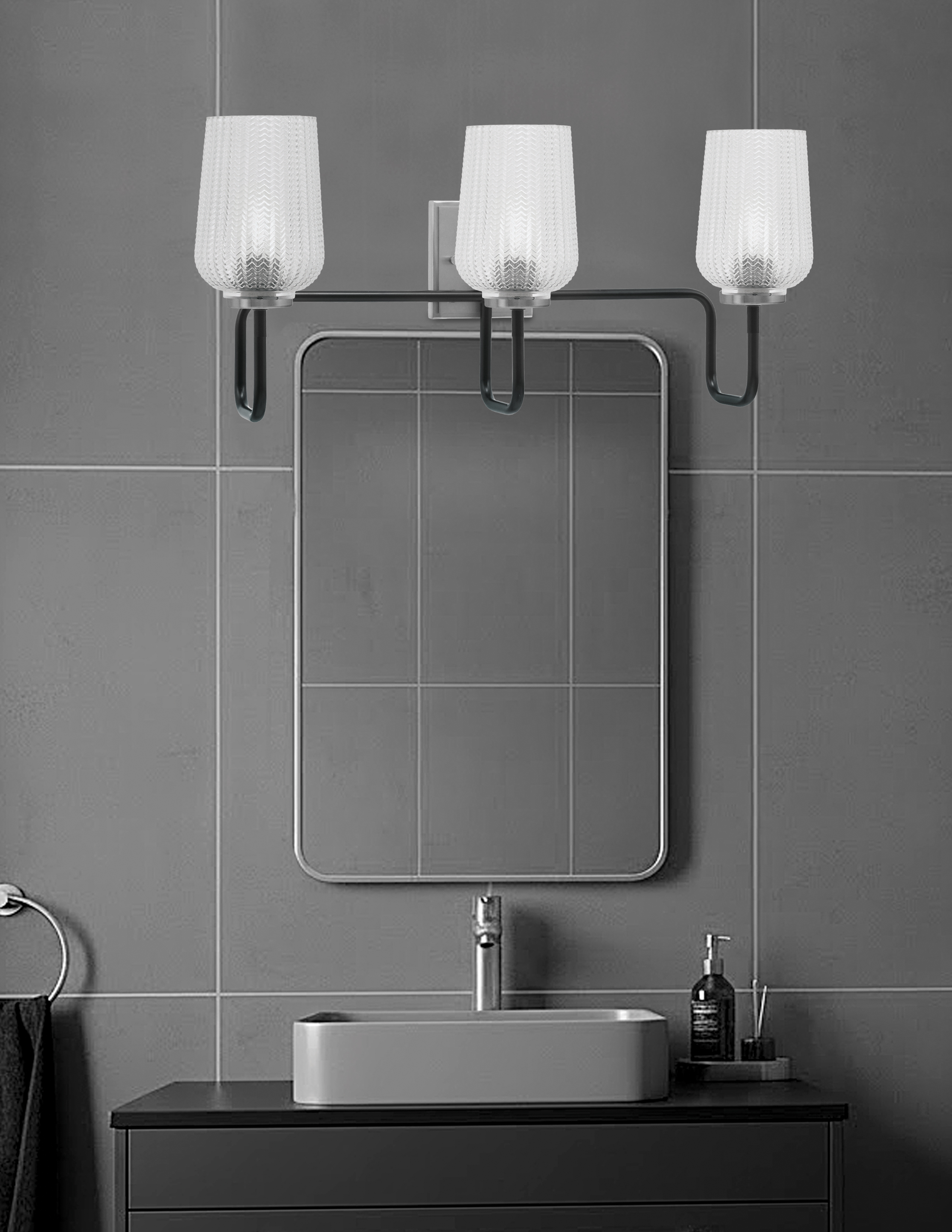 Transform your bathroom into a stylish retreat with the Sandia 3 Light Bath Bar. The sophisticated matte black and graphite finish complements the elegant 5″ clear textured glass shades, offering both form and function. This sleek, modern design provides the perfect balance of illumination and visual appeal.