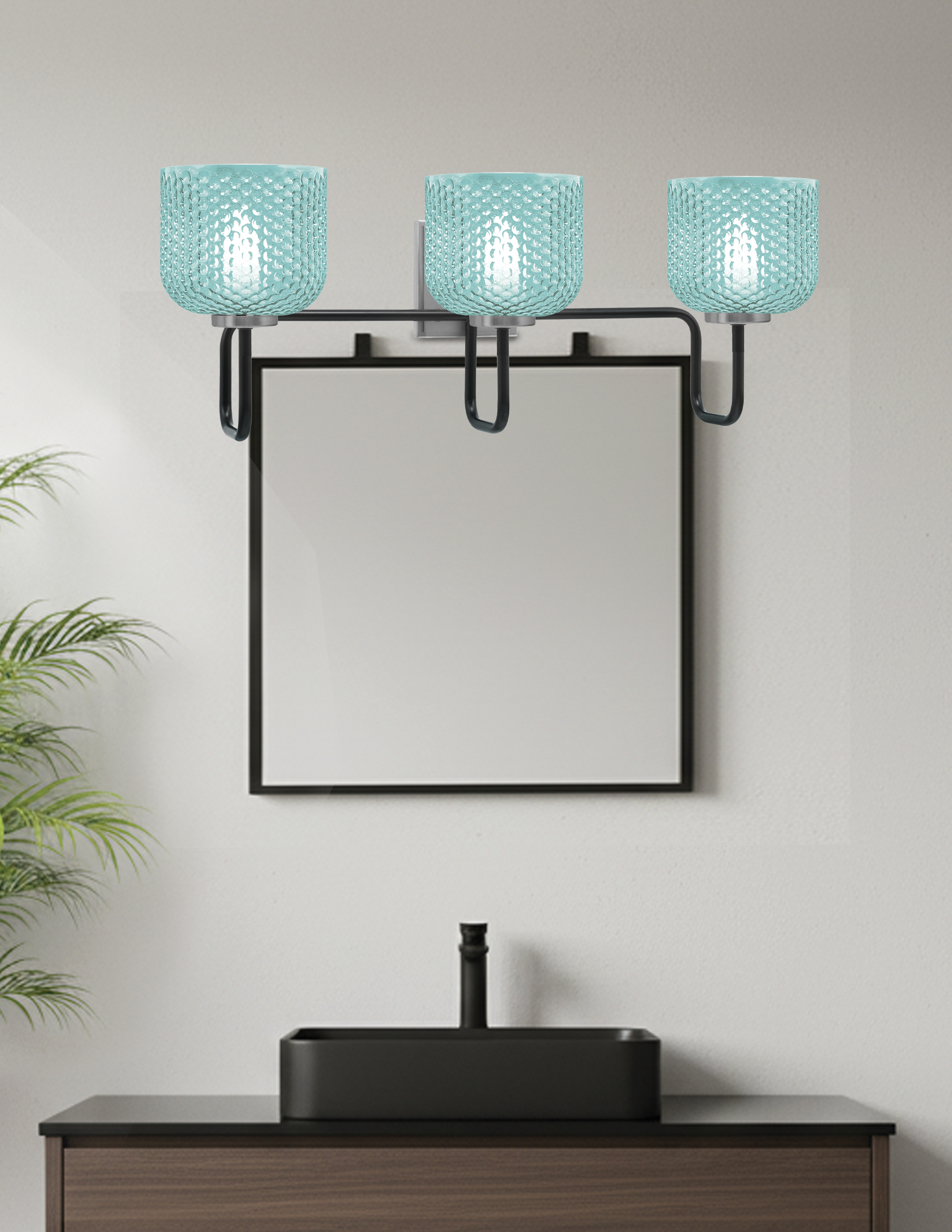 Add a striking pop of color and modern elegance to your bathroom with the Sandia 3 Light Bath Bar. The matte black and graphite finish perfectly complements the 6″ turquoise textured glass shades, bringing a vibrant yet sophisticated touch to any space. This bath bar combines bold style with practical lighting.