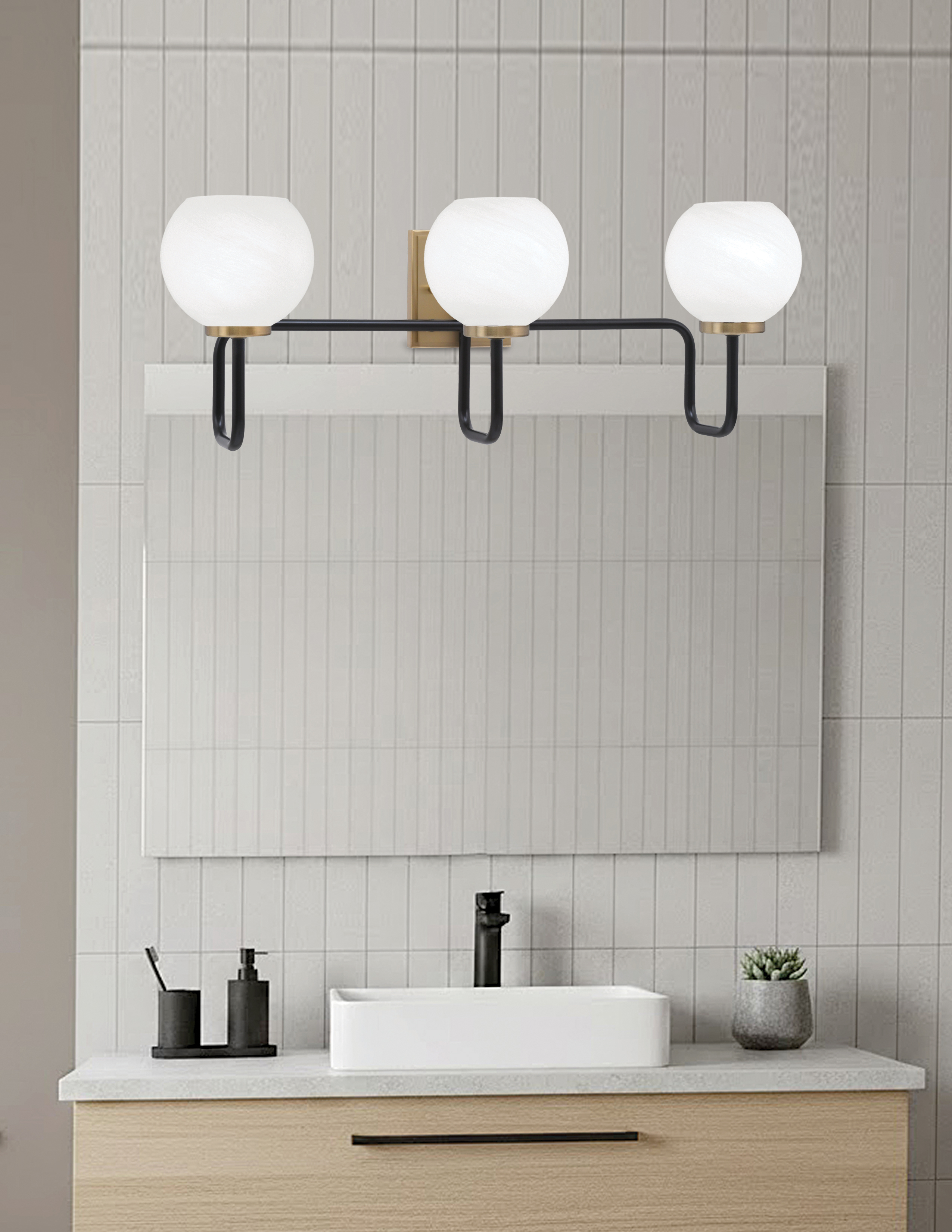 Elevate your bathroom with the chic design of the Sandia 3-Light Bath Bar. The bold Matte Black & New Age Brass Finish creates a striking contrast, bringing a modern touch to your space. The 5.75″ White Marble Glass shades feature a beautiful marble-like pattern that softens the light while adding a touch of sophistication.
