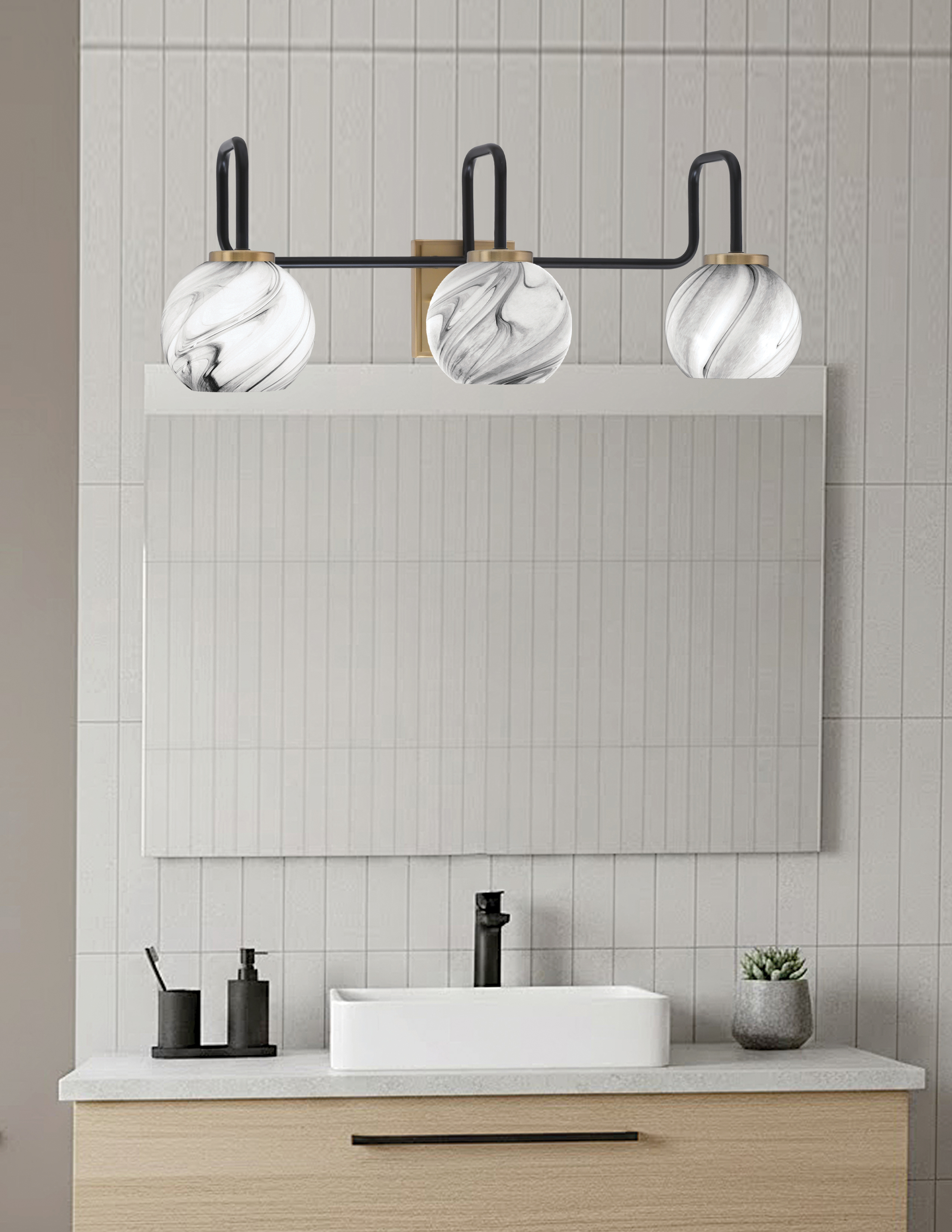 Bring sophistication and style to your bathroom with the Sandia 3-Light Bath Bar. Featuring a bold Matte Black & New Age Brass Finish, this fixture offers a modern contrast that enhances both contemporary and transitional spaces. The 5.75″ Onyx Swirl Glass shades luxurious swirling pattern diffuses light beautifully, casting a warm and inviting glow throughout your bathroom.