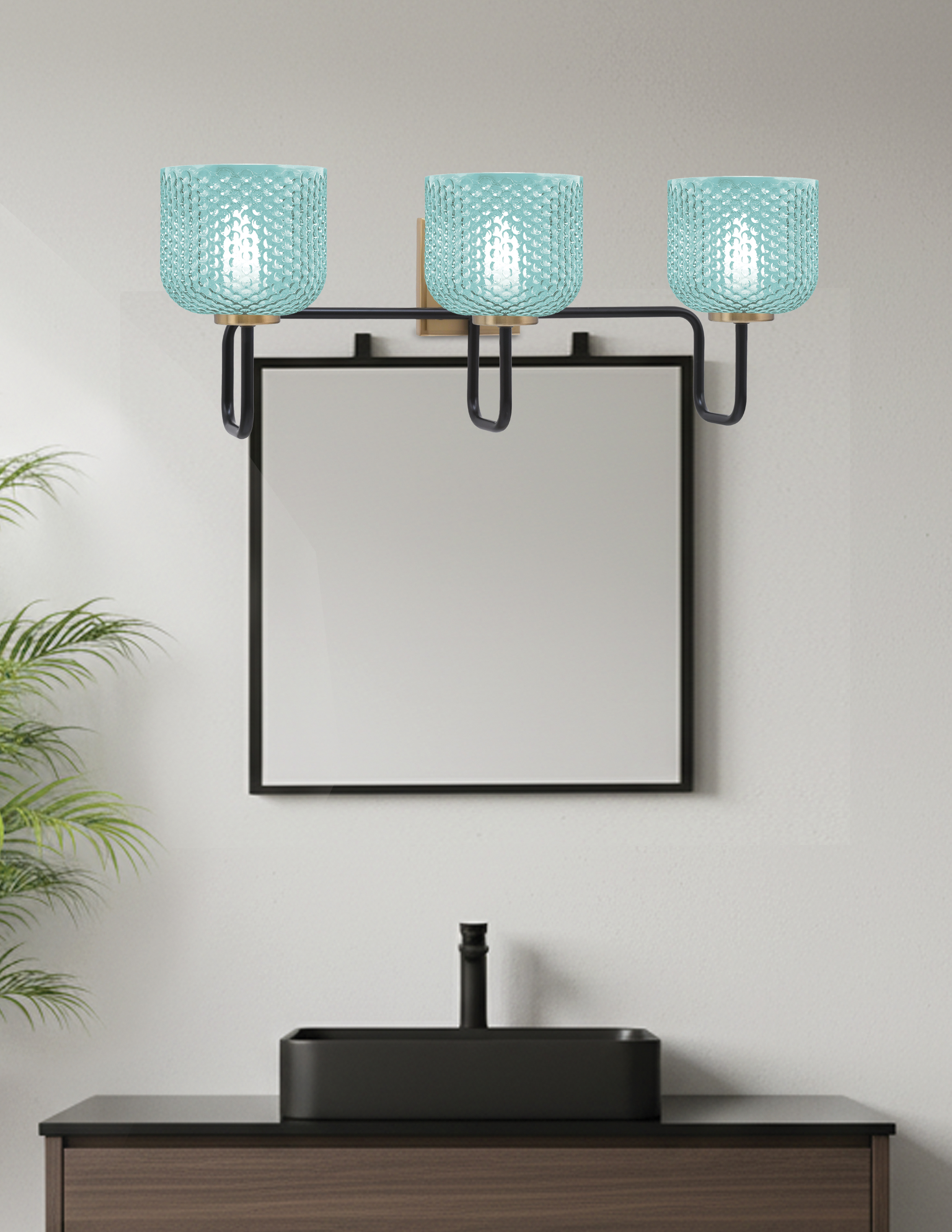 Elevate your bathroom’s style with the Sandia 3 Light Bath Bar, a striking fusion of modern sophistication and vibrant color. The Matte Black and New Age Brass finishes create an eye-catching contrast, adding a touch of contemporary charm. The 6″ Turquoise Textured Glass shades provide a refreshing pop of color, while casting a soothing glow throughout your space.