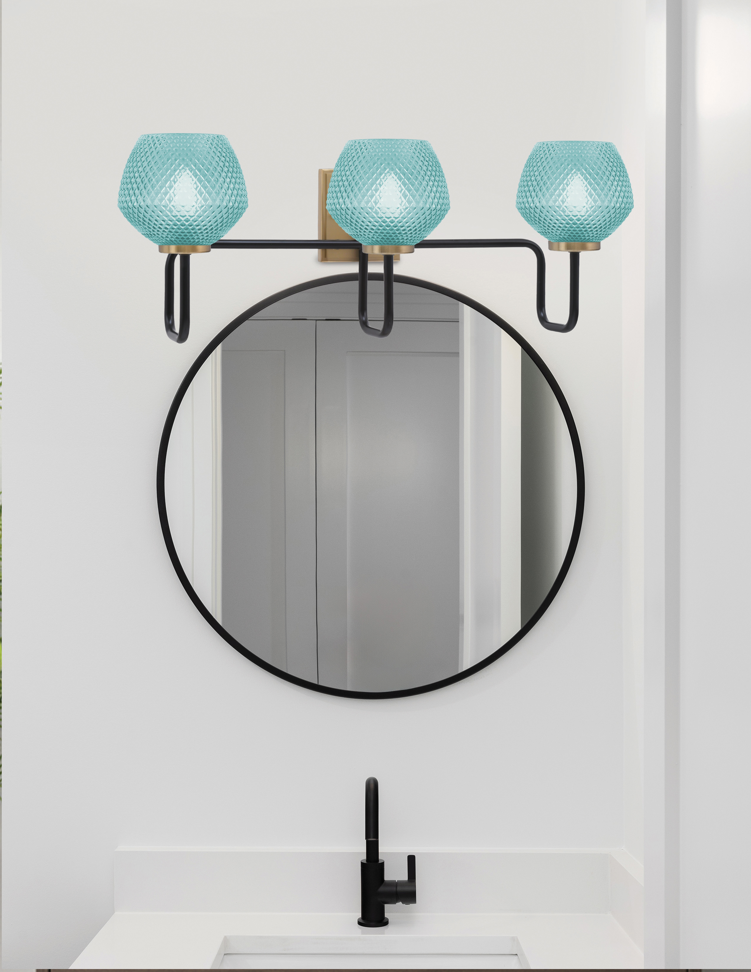 Add a vibrant touch to your bathroom with the Sandia 3 Light Bath Bar, designed to blend contemporary elegance with a pop of color. The Matte Black and New Age Brass finishes provide a chic contrast, enhancing the fixture”s modern appeal. The 6″ Turquoise Textured Glass shades bring a refreshing burst of color creating a warm and inviting glow.