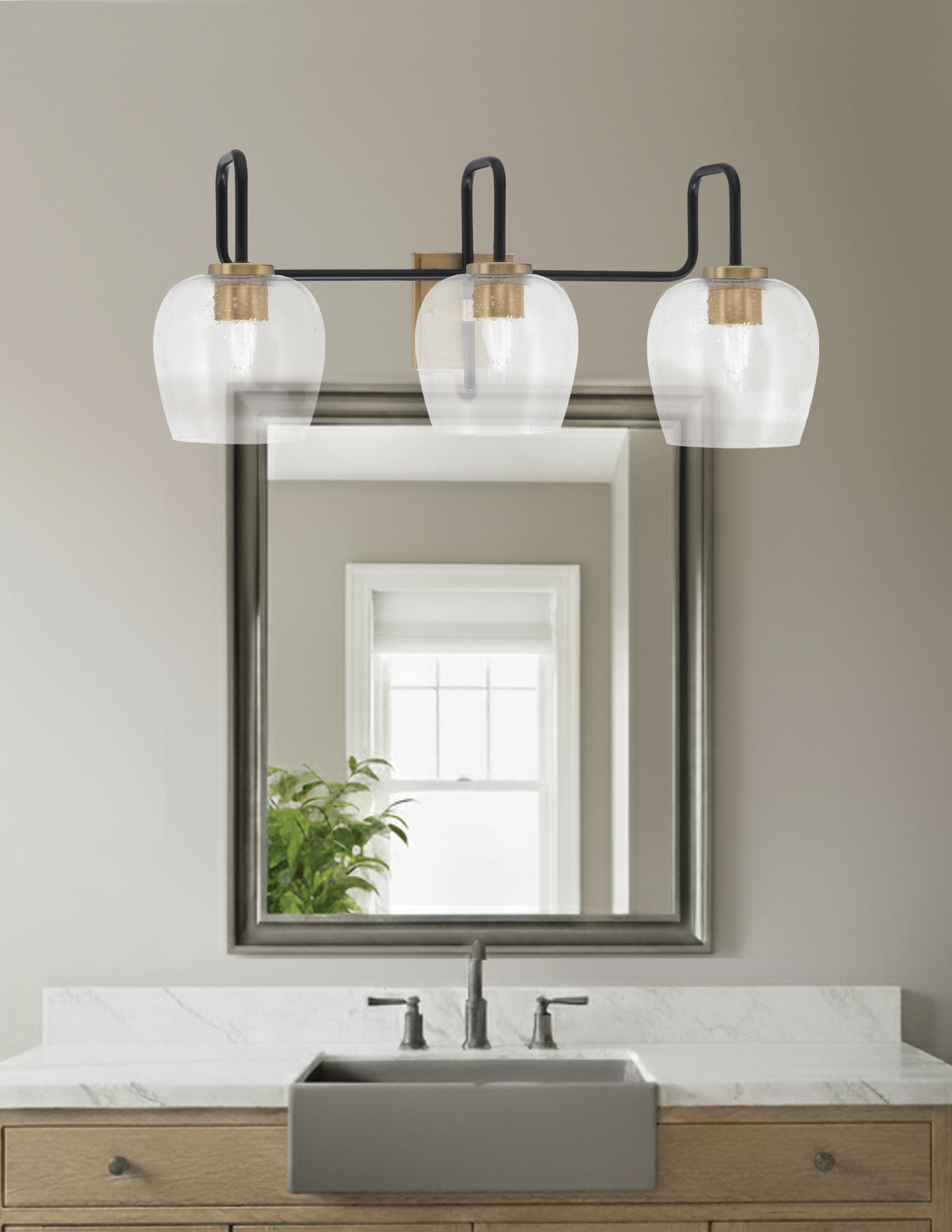 Bring a touch of modern sophistication to your bathroom with the Sandia 3 Light Bath Bar. Featuring a striking blend of Matte Black and New Age Brass finishes, this fixture combines sleek, contemporary style with timeless elegance. The 6″ Clear Bubble Glass shades add texture and depth, casting a soft, ambient light that enhances the atmosphere of any space.