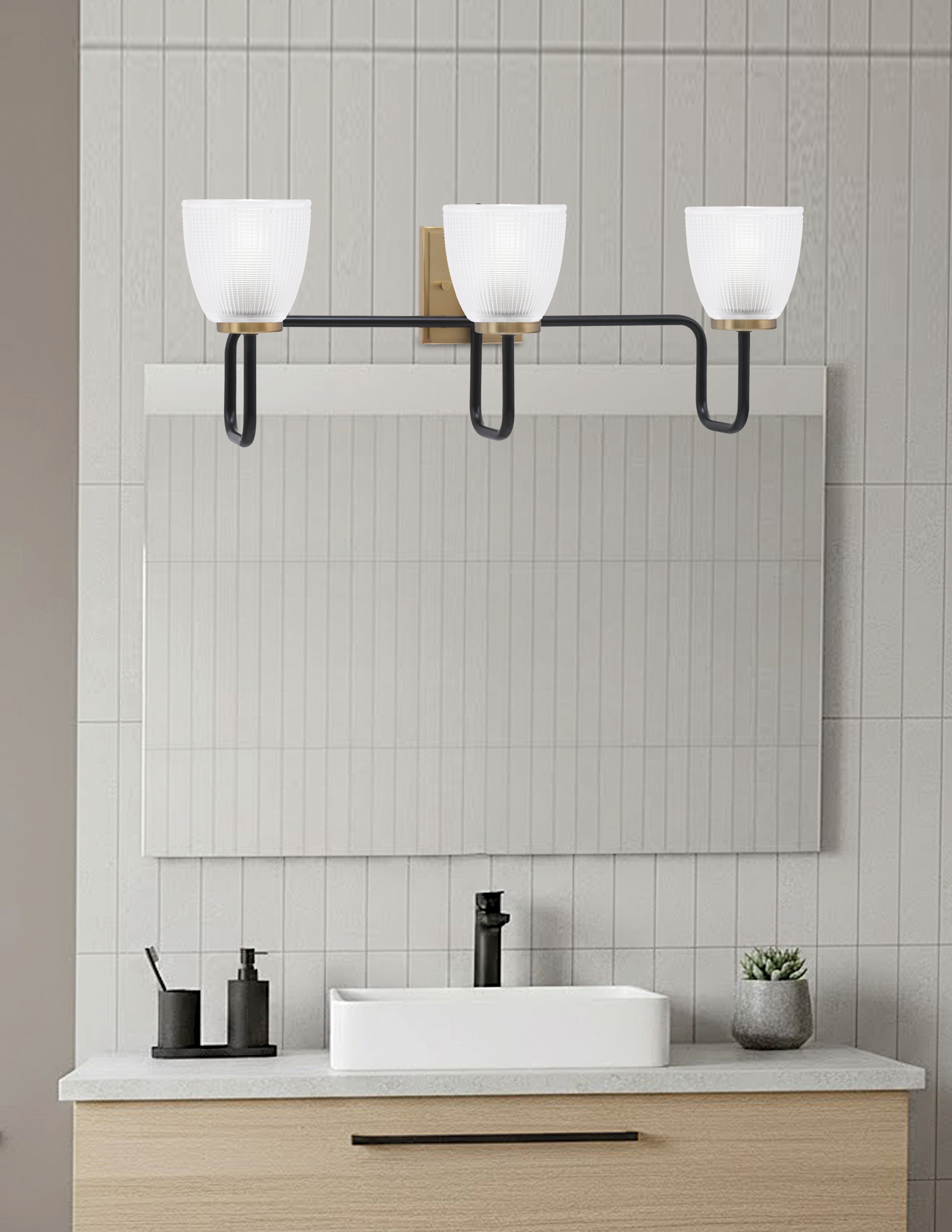 Infuse your bathroom with modern elegance using the Sandia 3-Light Bath Bar. The bold Matte Black & New Age Brass Finish creates a striking contrast, bringing a refined touch to contemporary and transitional interiors. The 5″ Clear Ribbed Glass shades add a textured detail, beautifully refracting light to create a soft, inviting ambiance.