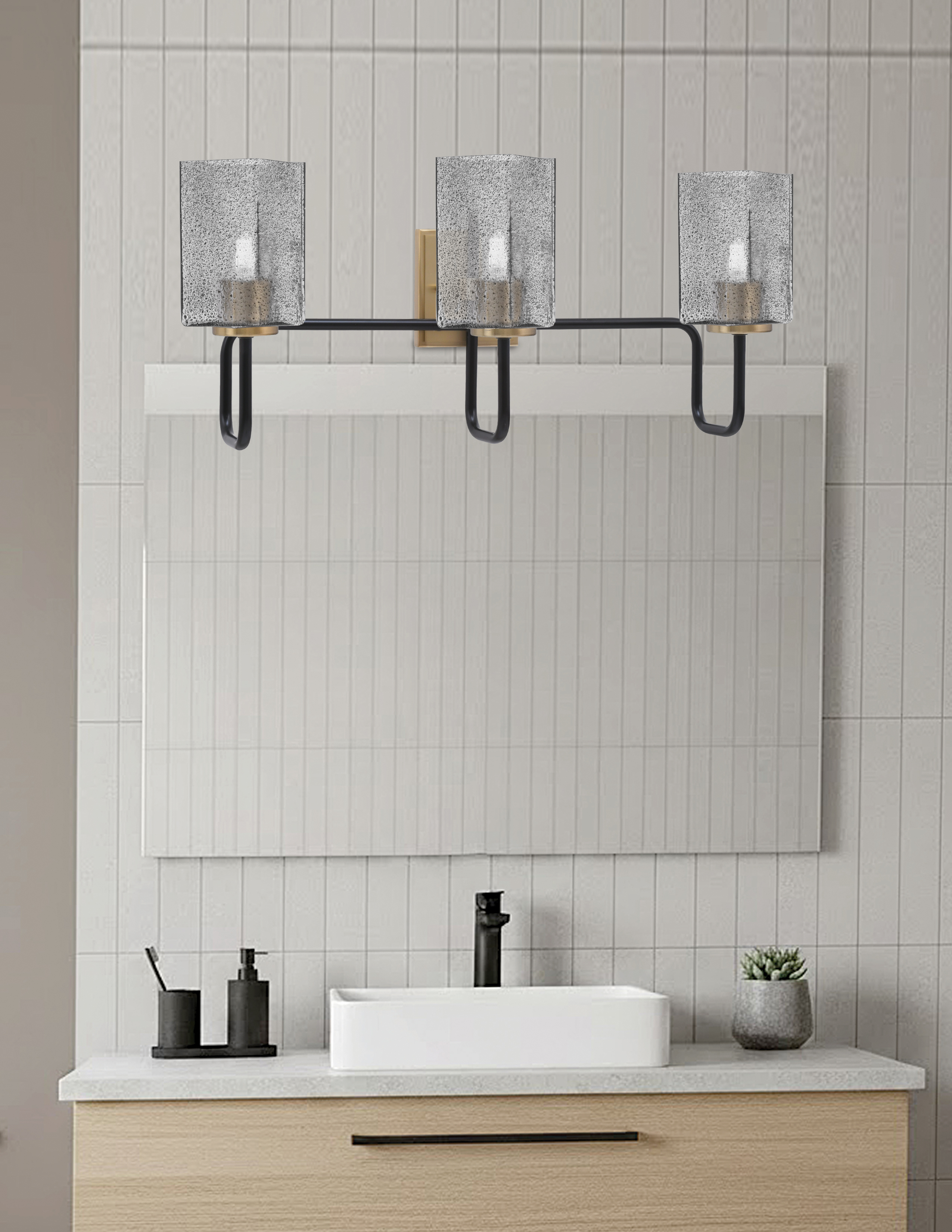 Transform your bathroom with the striking beauty of the Sandia 3-Light Bath Bar. The combination of Matte Black & New Age Brass Finish creates a bold and contemporary contrast, adding sophistication to your space. The 3.5″ Square Smoke Bubble Glass shades bring a touch of textured elegance, gently diffusing light to create a warm, inviting atmosphere.