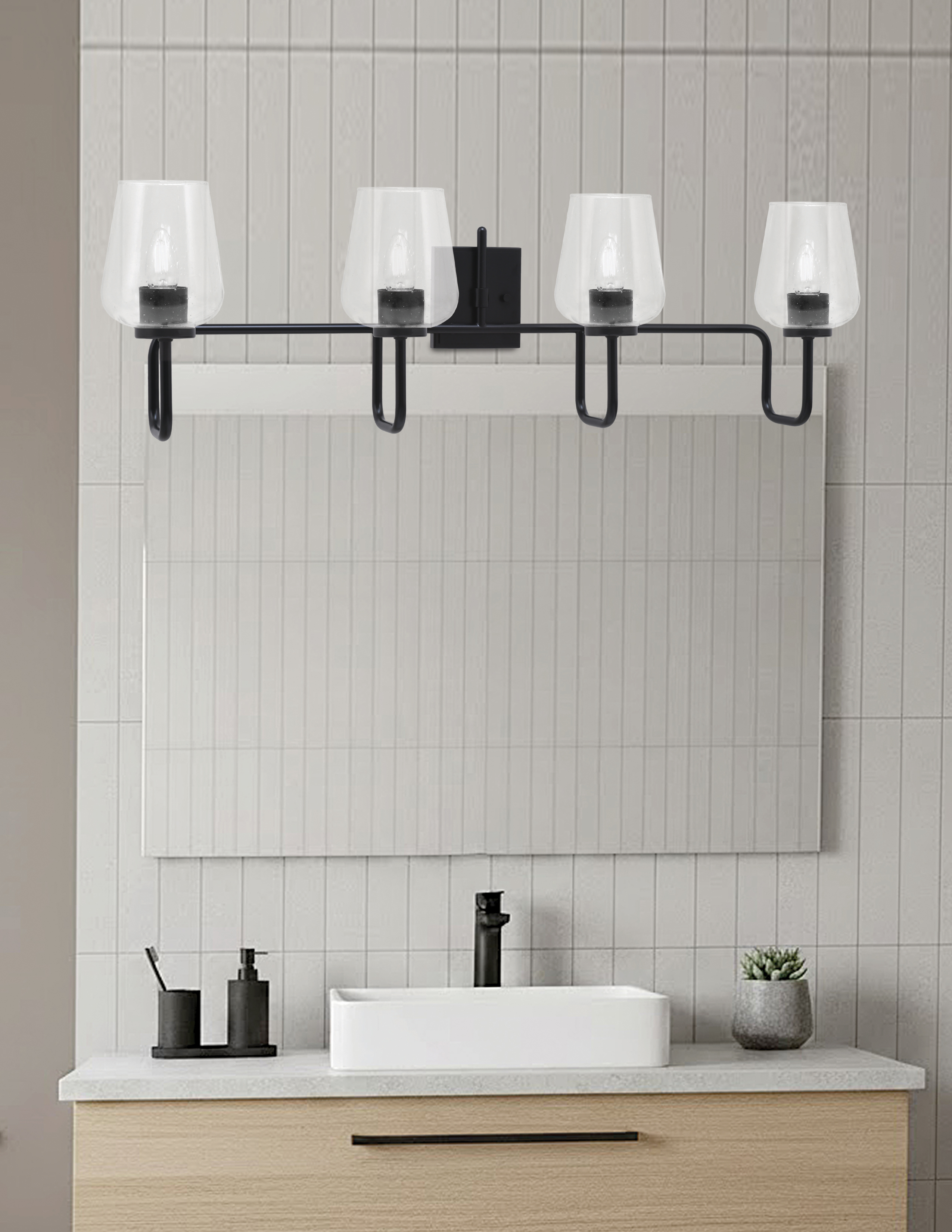 Elevate your bathroom with the sleek and modern Sandia 4 Light Bath Bar. Featuring a bold matte black finish, this fixture is complemented by 5″ clear bubble glass shades that add a touch of sophistication. Perfect for contemporary, industrial, or transitional spaces, this bath bar combines striking design with practical illumination.