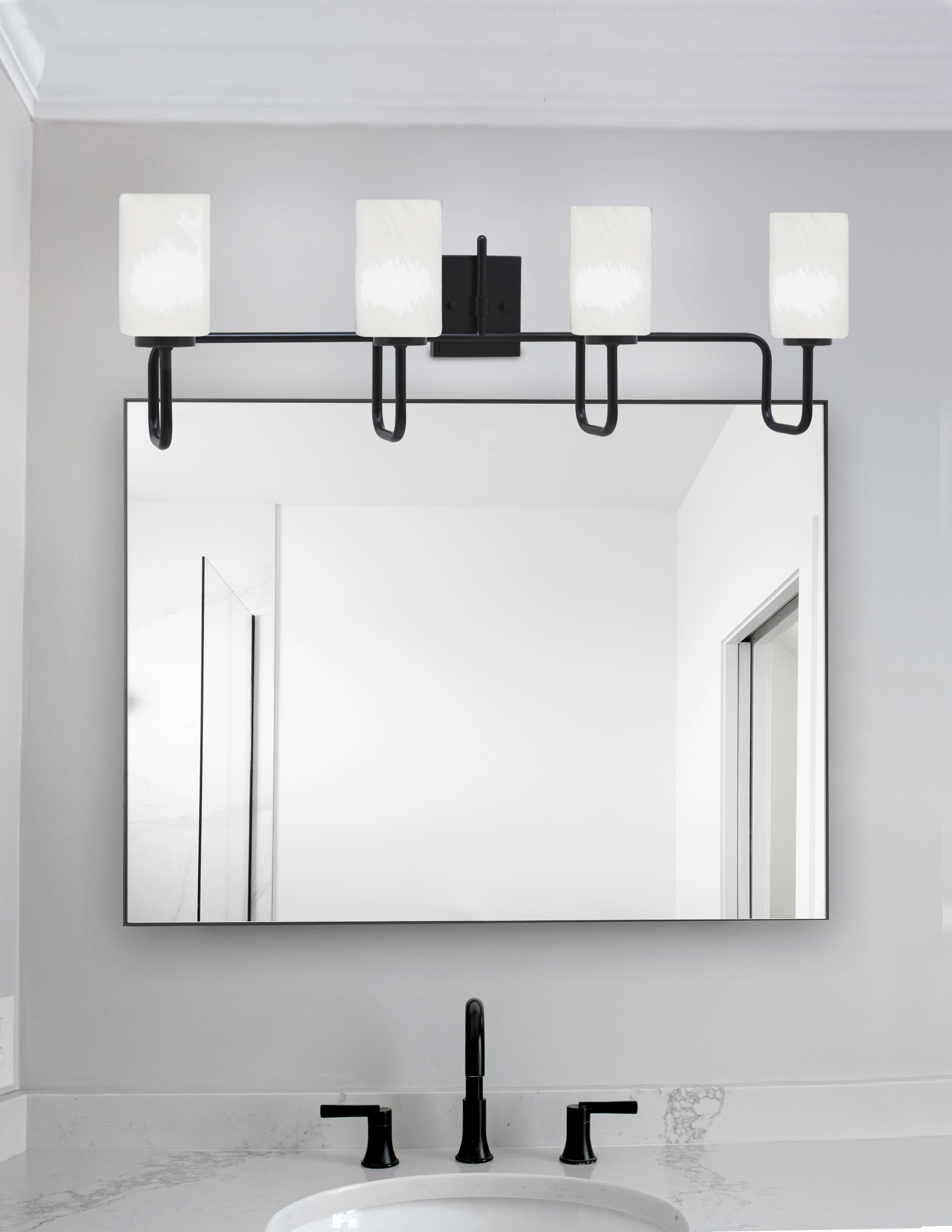 Elevate your bathroom with the timeless elegance of the Sandia 4-Light Bath Bar. The bold Matte Black Finish offers a sleek, modern contrast, while the 4” White Marble Glass shades feature soft veining that beautifully diffuses light, creating a warm and inviting ambiance. The Sandia bath bar delivers both style and functionality.