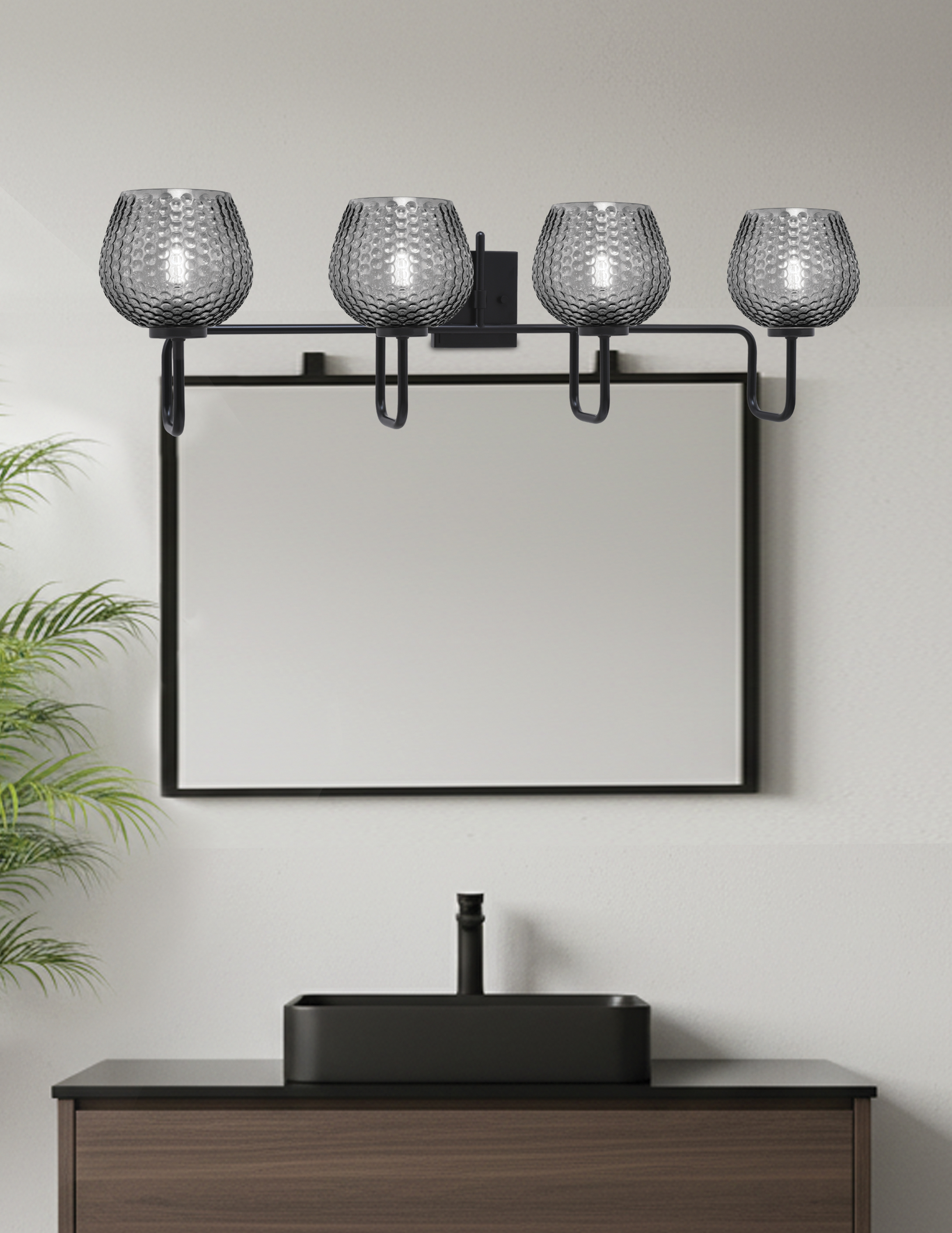 Make a bold statement in your bathroom with the Sandia 4-Light Bath Bar. The striking Matte Black Finish offers a sleek, modern look, while the 6” Smoke Textured Glass shades feature a rich, smoky tint and a beautifully textured surface that diffuses light softly. Perfect for contemporary, industrial, or transitional interiors.