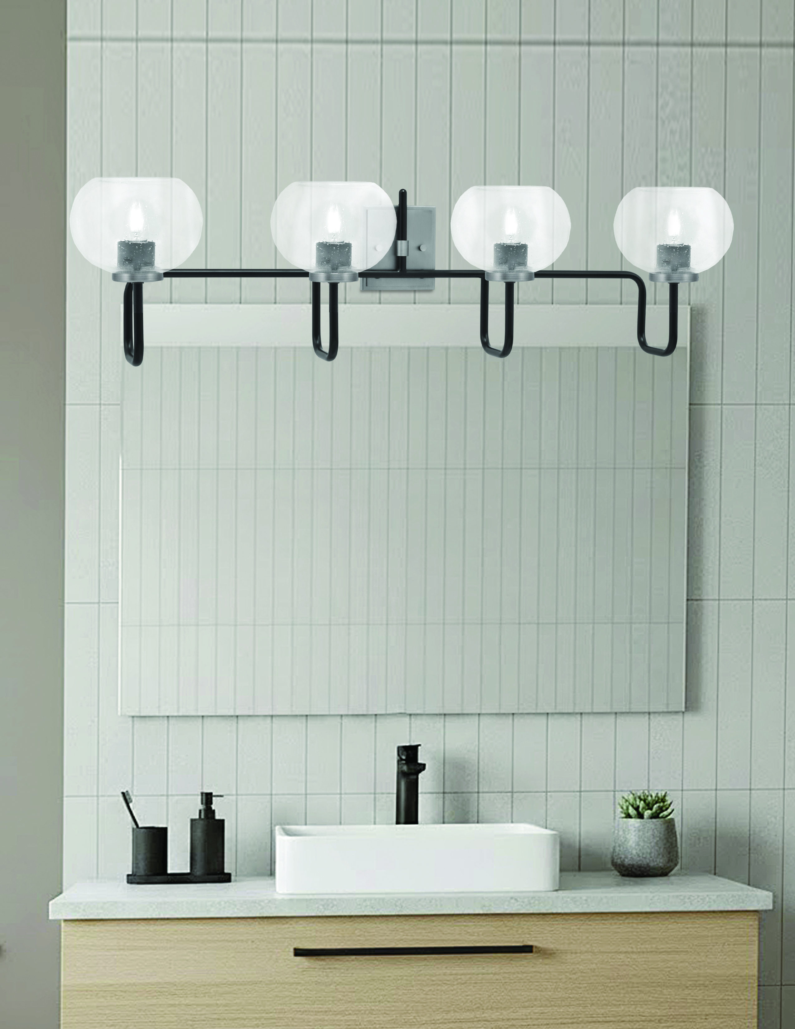 Create a bold and modern statement in your bathroom with the Sandia 4-Light Bath Bar. The combination of Matte Black and Graphite Finish brings a striking industrial aesthetic, perfectly complemented by the unique 7” Clear Bubble Glass shades. The textured bubble glass creates a visually dynamic effect while diffusing light softly, filling your space with a warm and inviting glow.