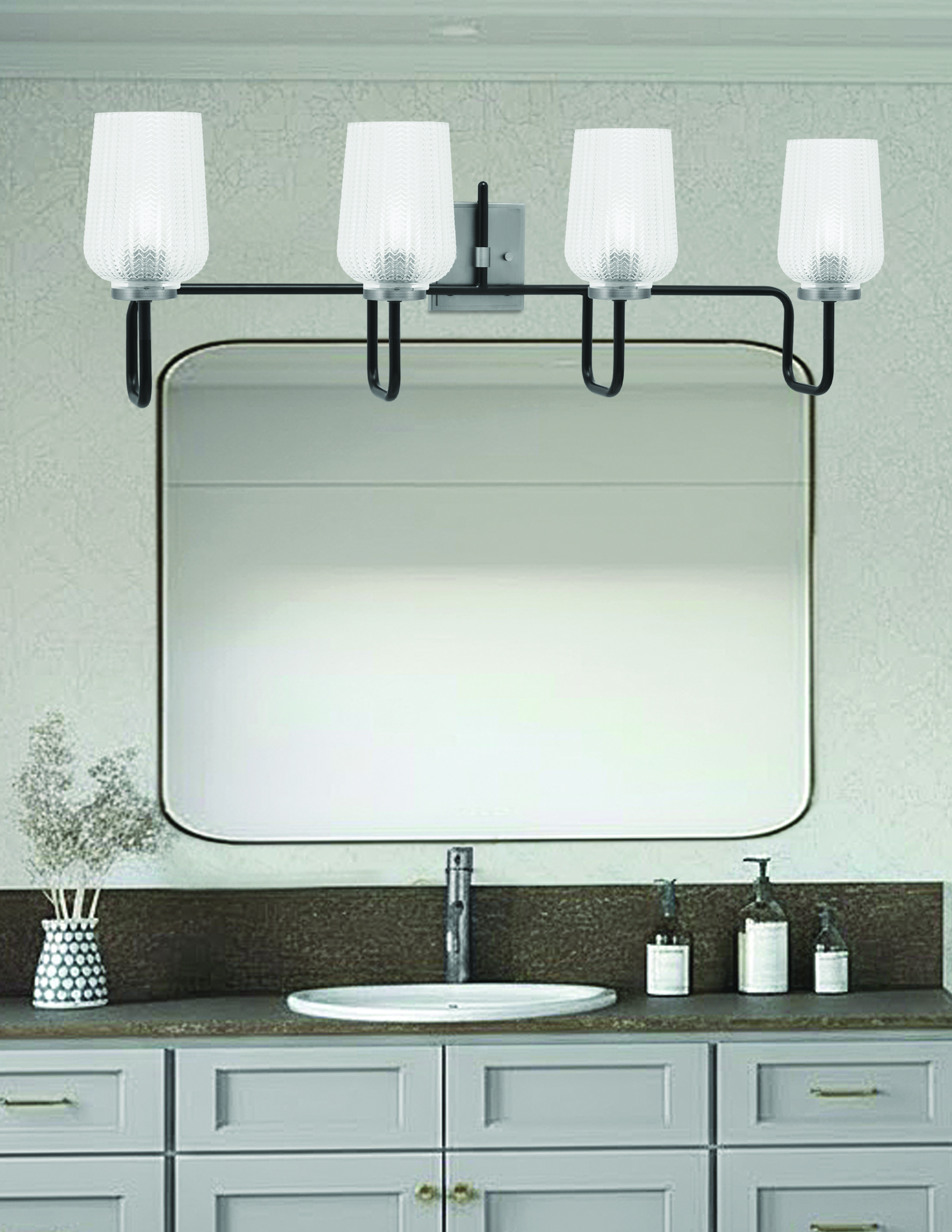 Refine your bathroom with the Sandia 4 Light Bath Bar. The combination of Matte Black and Graphite finishes adds depth and dimension, giving your space a refined, high-end look. The clear textured glass shades introduce a subtle yet captivating element, dispersing light in a way that creates dynamic reflections. A perfect choice for contemporary, industrial, or transitional interiors.