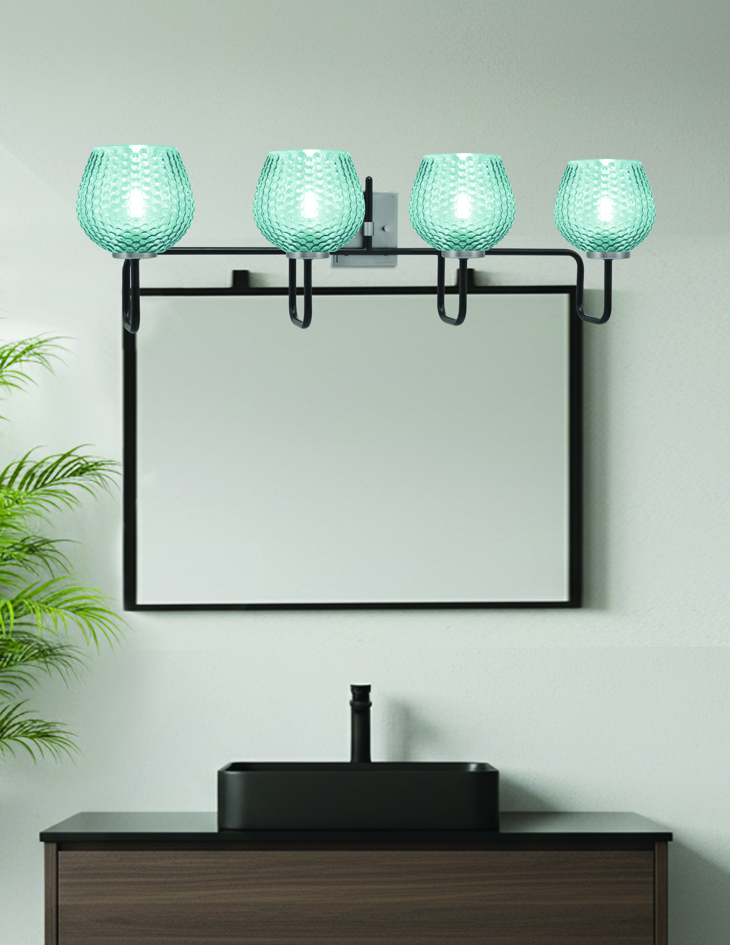Infuse your bathroom with a vibrant pop of color and modern sophistication with the Sandia 4 Light Bath Bar. Featuring a unique Matte Black and Graphite finish, this fixture combines bold, industrial tones with the refreshing beauty of turquoise glass. The four 6-inch turquoise textured glass shades are a true statement piece, making the bath bar perfect for those looking to add personality and style to their bathroom.
