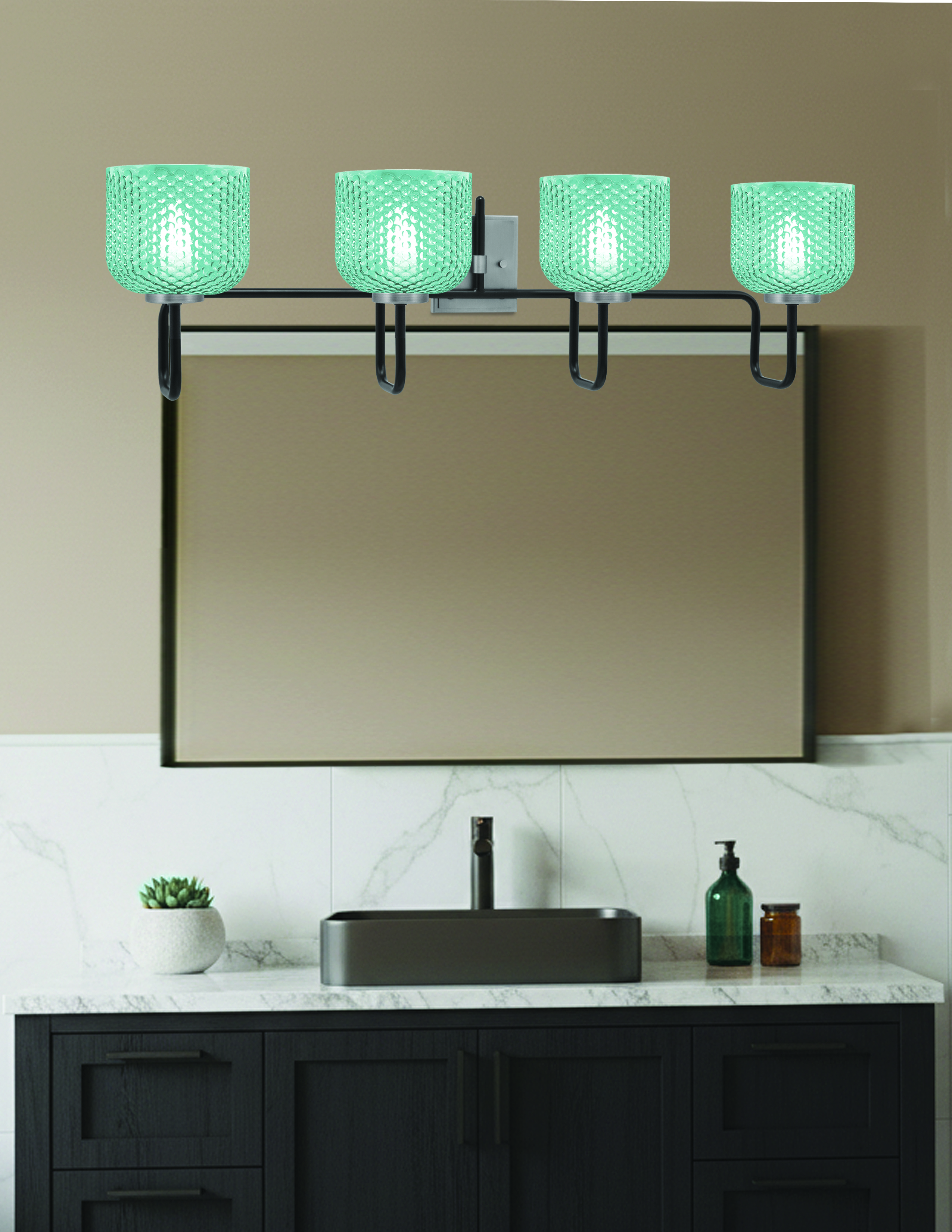 With its bold design and vibrant glasswork, the Sandia 4 Light Bath Bar is a perfect addition to your bathroom.The striking Matte Black & Graphite finish combines sleek industrial tones with a stunning pop of turquoise textured glass. The four 6-inch turquoise textured glass shades intricate texture adds visual interest and also enhances the light diffusion, casting a soft yet vibrant glow throughout the room.